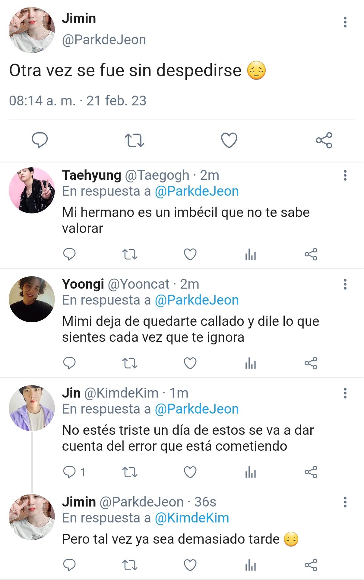 La luz del sol dando de golpe sobre su rostro lo despertó, aún con los ojos cerrados Jimin estiró su mano tocando el espacio vacío en el lado izquierdo de su cama, suspiró, se talló los ojos y se sentó sobre la cama, su mirada triste viajó hasta su mesilla de noche y tomó su celular. ¿Tal vez hubiera un mensaje de buenos días? Pensó aunque sabía que no encontraría nada.