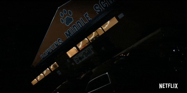 The light and blithe tune of Bobby Helms' classic, 'Jingle Bell Rock' fills the Hawkins Middle School gym as everyone prepares for the annual Snow Ball. A mix of faculty and volunteers are spread across the gym hanging decorations, including Mr. Clarke who finishes hanging the large banner reading; Hawkins Middle Snow Ball '84.