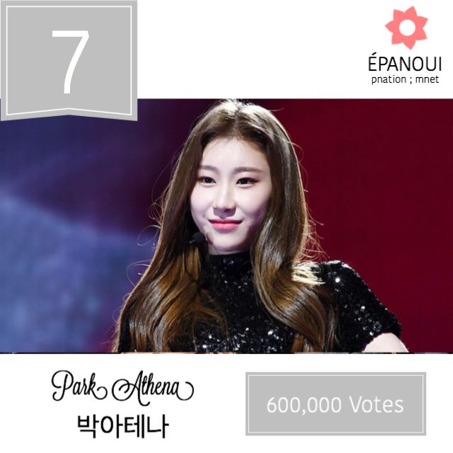 park athena (7 // pledis): uhh, this is... a bit disappointing, isn't it? such a pity... well anyways, i would like to say thank you to my fans, friends and family for always supporting me and loving me, seriously, without all of you, i wouldn't be here. for the rest of the trainees, congrats! you've all made it so far and you guys 100% deserve it. uhh good luck to bouquet, i will for sure work harder next time to not disappoint you all! always and forever, athena!
