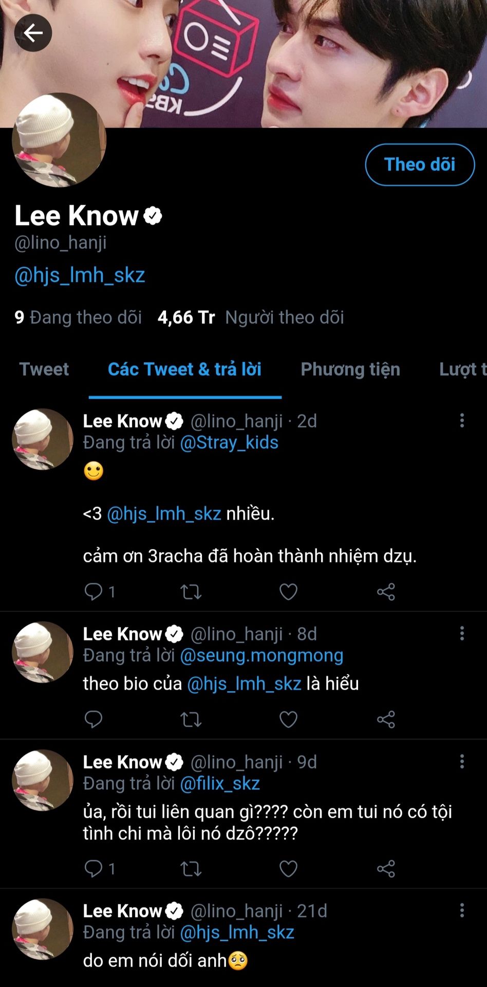 Lee Know: Main dancer của SKZ. Là người khá cọc tính, tuy nhiên lại dịu dàng và nhường nhịn hết mức khi làm việc hay trò chuyện với em người yêu. Sinh viên năm 3 khoa vũ đạo, ngành nhảy hiện đại.