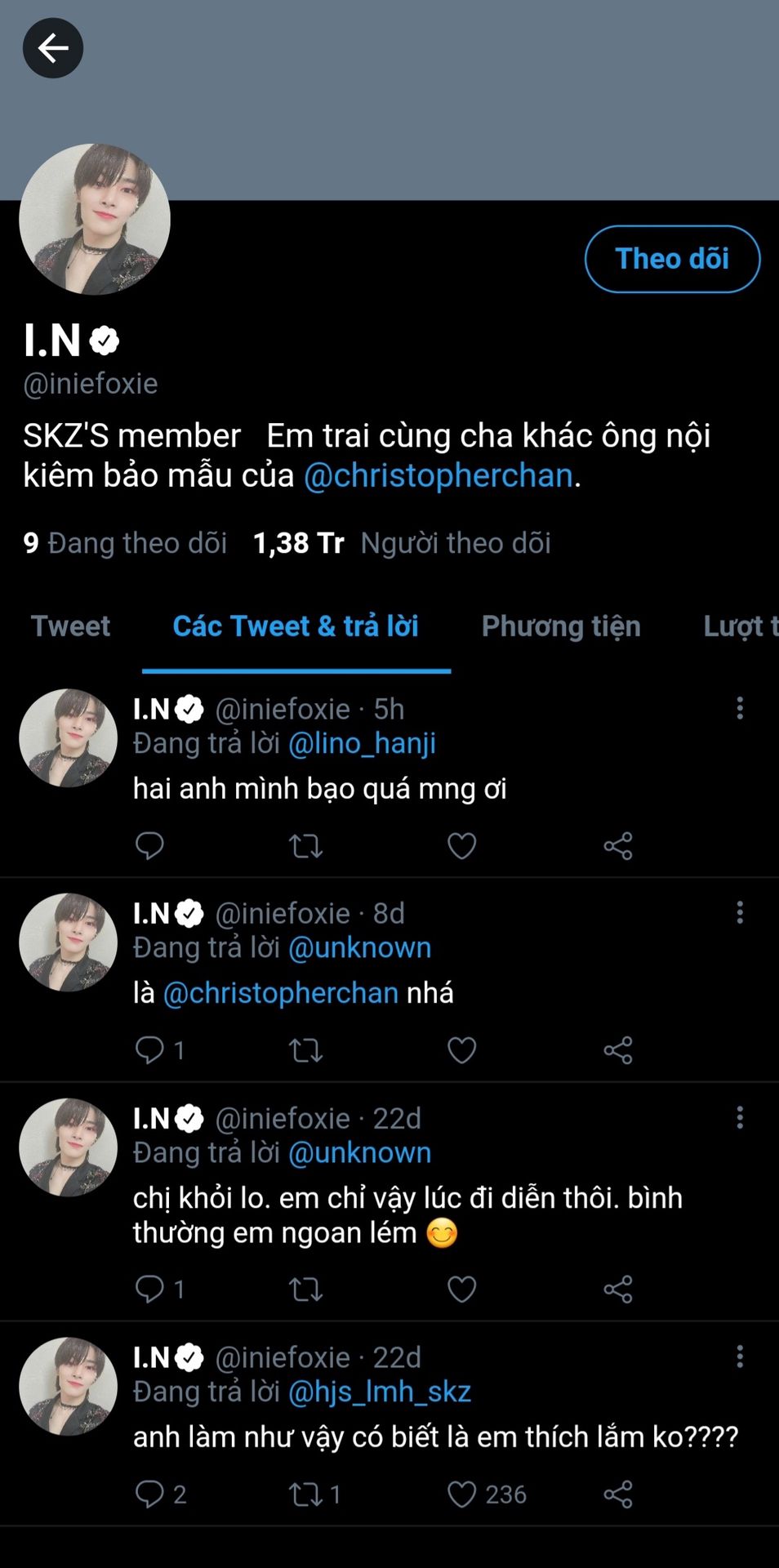 I.N: Sinh viên năm nhất khoa thanh nhạc. Là em út của SKZ. Cậu nhóc đáng yêu nhưng ghét skinship. Tuy vậy, cậu rất được lòng các chị trong trường vì vẻ ngoài đáng yêu. Thành viên SKZ
