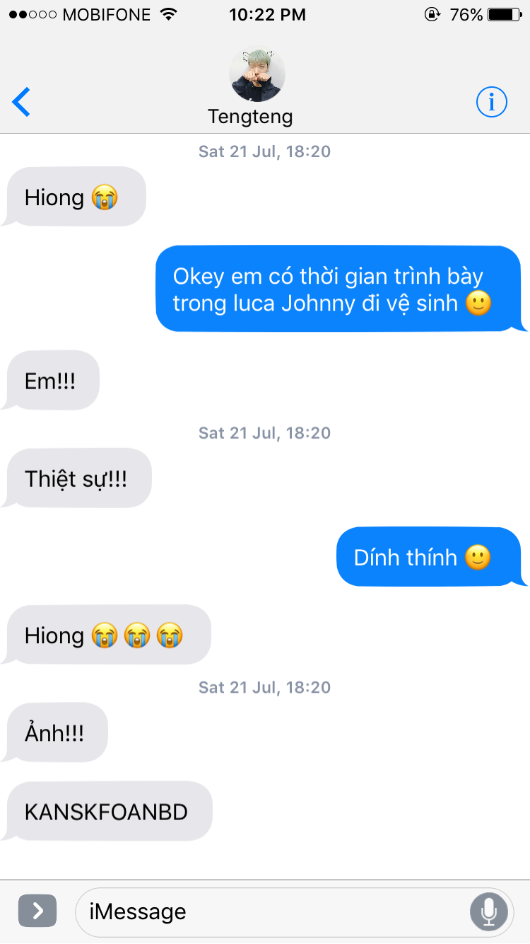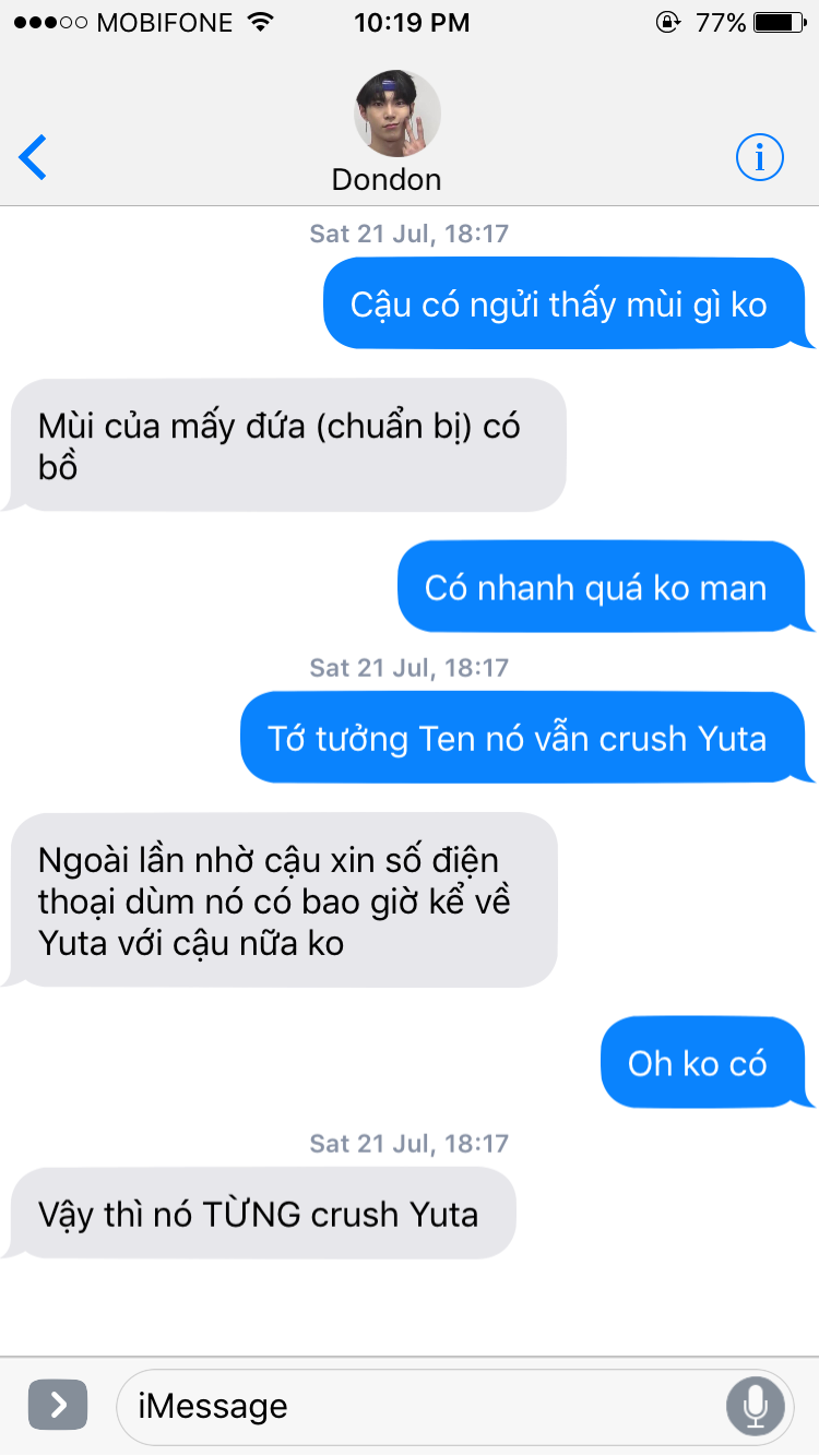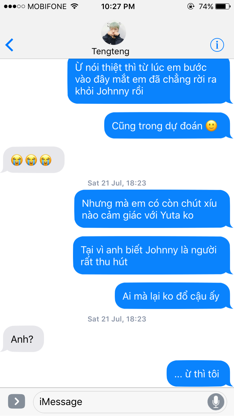 Đọc lại thì thấy lỗi chính tả và đoạn tin nhắn dài Ten nhắn cho Taeyong có thể gây hiểu lầm. "Ảnh" lần đầu là nói Yuta còn "ảnh" sau đó là Johnny nha. Lỗi chính tả thì... cho nó giống nhắn tin thiệt 😁 Ờ đó chỉ là sự nguỵ biện của toiiii Toiiii quá lười biếng để sửa 😭 Mọi người hãy bỏ qua nha!!!