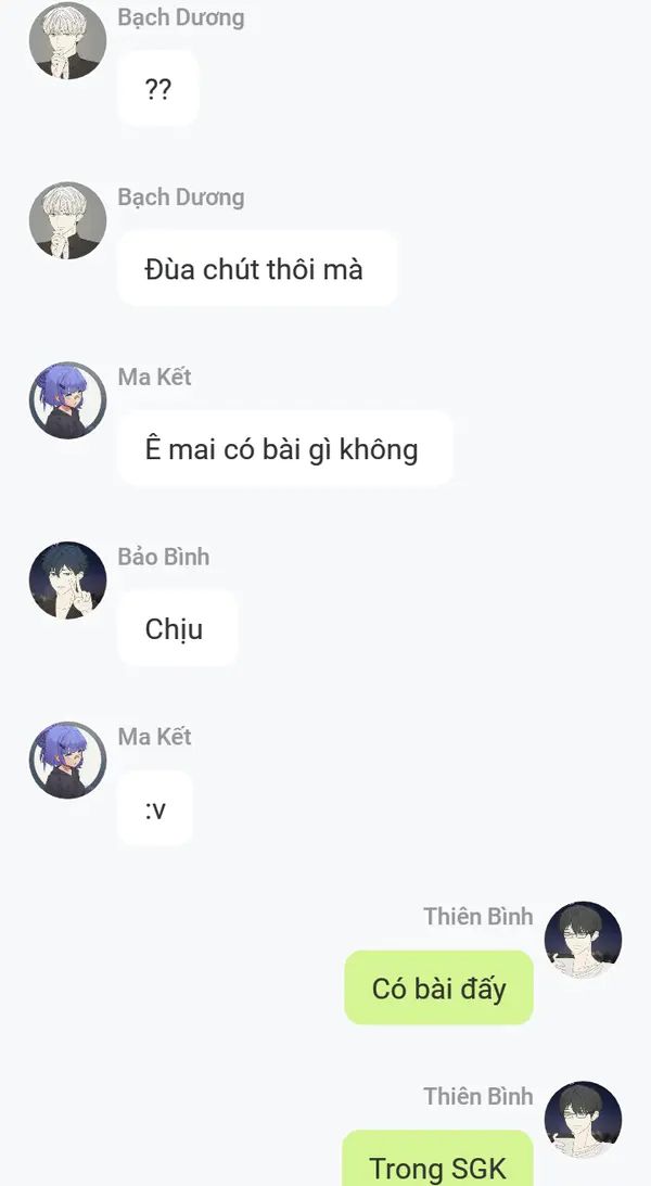 Sau khi ấp úng một hồi họ leo lên giường, chẳng dám bắt chuyện với đối phương. Thiên Bình đã lập một nhóm chat để mọi người có thể giao tiếp với nhau hơn vì nhưng vấn đề trong học tập nhưng lại phát bực vì họ chỉ nói những điều vớ vẩn chẳng liên quan :