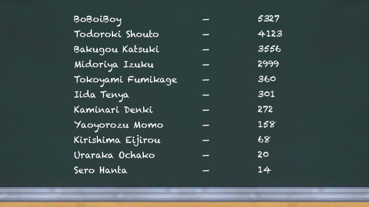 Midnight nodded her head, and BoBoiBoy quickly sat up in his seat and made his way to the podium upfront. Once there, BoBoiBoy took one more look at what he wrote, 「 I've been done for quite a while now since I already have one. 」 He admitted, grinning widely, as he turned his canvas around to display his hero name.