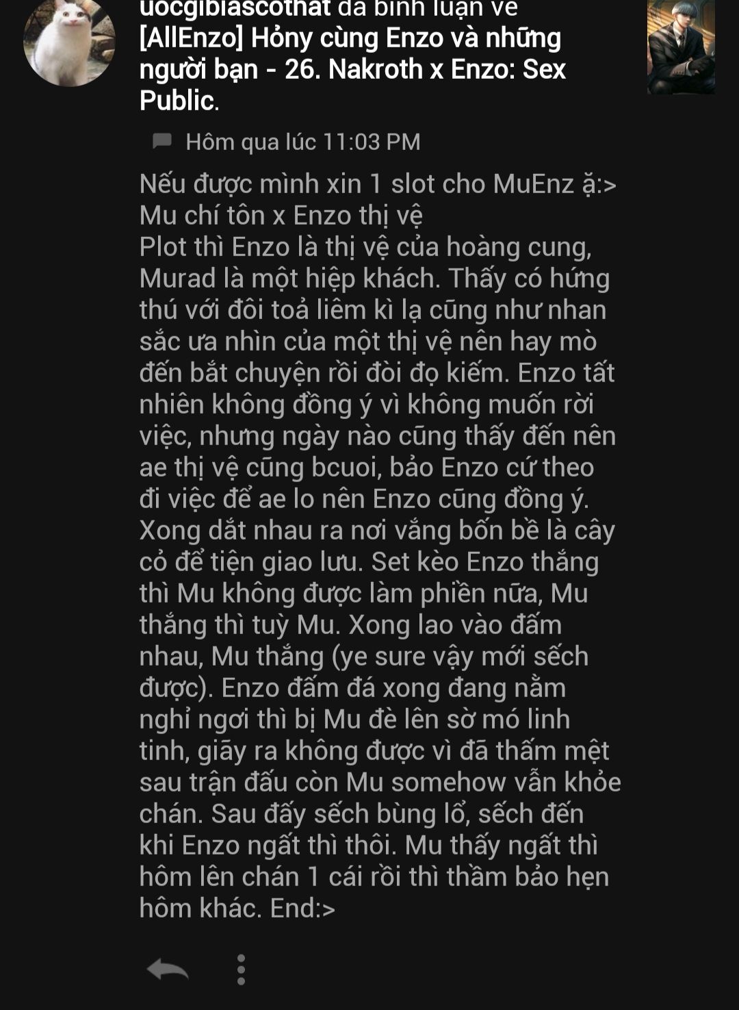 Enzo ngửa cổ để né tránh, nhưng đeo bám là nghề của Murad, dù cậu có quay sang hướng nào, cái lưỡi ấy vẫn mơn trớn theo trên từng hơi thở, đôi lúc liếm lên cằm của Enzo khiến cậu không khỏi kinh tởm. Chiếc lưỡi nhỏ bị Murad hưởng thức, muốn vắt khô cả nước bọt, núc đến mức Enzo tê tái, những tưởng không nói được nữa.
