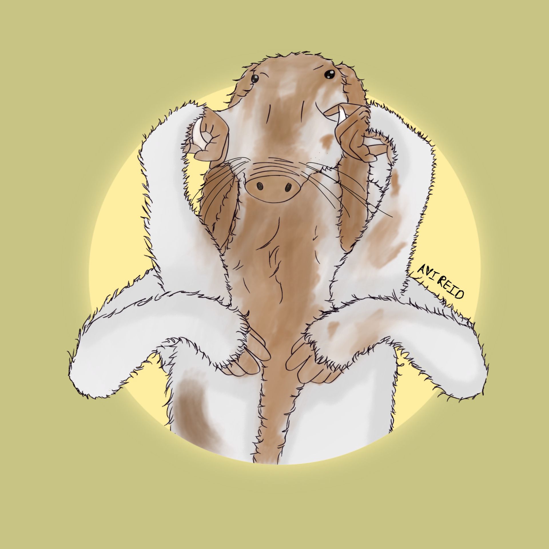 The Four Armed Chimp Hog is a chimera of sorts comprised of warthog, chimpanzee, and rabbit characteristics. This animal can get up to 3 to 5 feet tall and is strictly a herbivore. These animals are pack animals and will help keep each other clean. Their four arms and prehensile feet give them the ability to climb trees which are abundant in their habit. The males grow tusk in which are used to get a mate since a female prefers her partner to have the biggest tusks and brightest coat. The coats of this creatures are as soft and beautiful which causes them to be hunted down. There are more females in the wild since females have darker coats making them blend in.