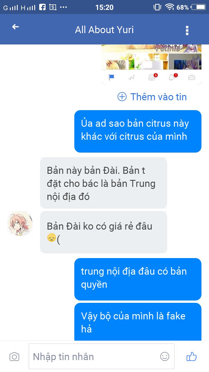 Mình inbox hỏi bạn ấy:;'Ủa ad sao bản này khác với Citrus của mình (mua)' , mình đưa hình truyện Citrus bản Đài thật cho bạn ấy xem và bạn ấy nói nguyên văn với mình là 'BẢN NÀY LÀ BẢN ĐÀI. BẢN T ĐẶT CHO BÁC LÀ BẢN TRUNG NỘI ĐỊA ĐÓ. BẢN ĐÀI KHÔNG CÓ RẺ ĐÂU.''