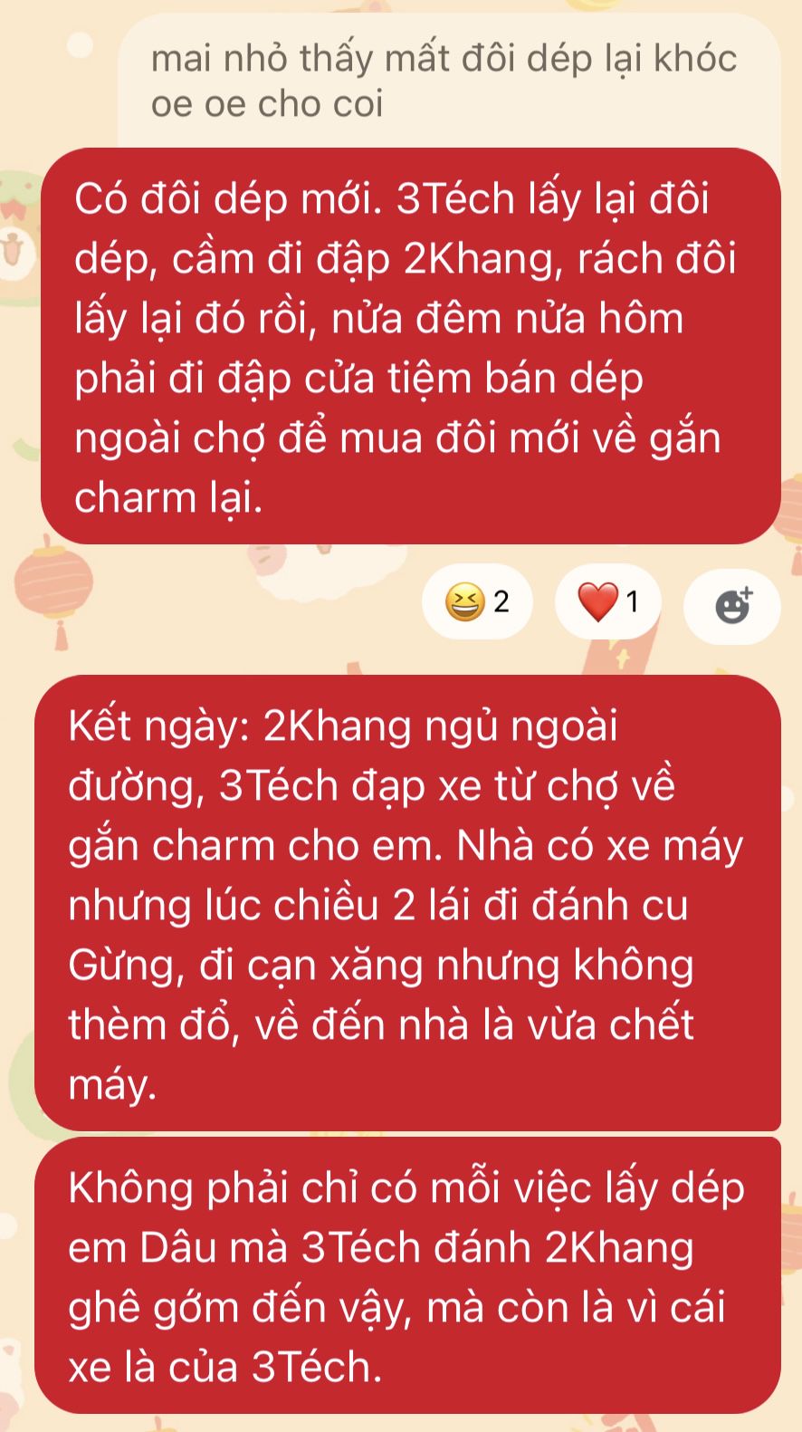 Có hai thanh niên nửa đêm nửa hôm còn lôi nhau đạp xe lạch cạch ra chợ đòi mua dép tổ ong, mà phải màu đỏ, phải có hạt đính. May mắn ông trời có mắt, còn có một sạp chuyên bán những thứ ấy, lấy rẻ cho hai anh em.