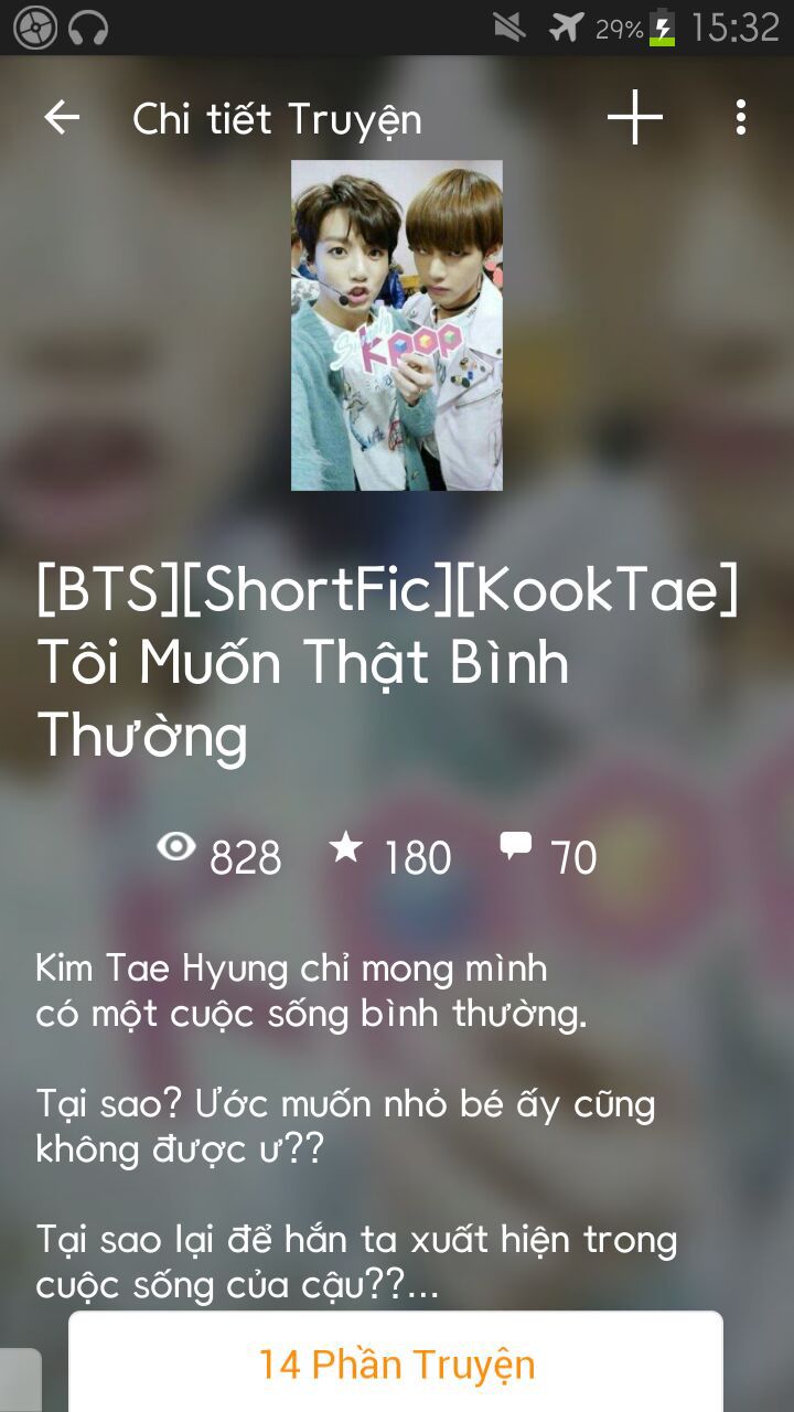 Một giọng nói ngọt ngào xen lẫn giận dữ nhưng lại vô cùng quen thuộc vang lên, Tae Hyung giật mình quay ra, trời đất, một thanh niên mặc áo phông quần jean đeo khẩu trang đen giản dị nhưng lại vô cùng cuốn hút, mái tóc nâu thẳng mềm mại, là Jung Kook! Sao hắn lại ở đây?!!