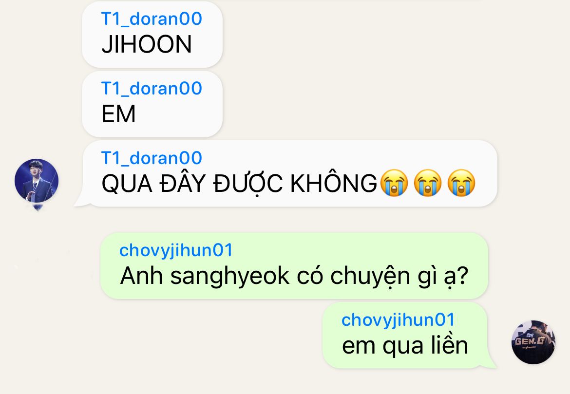 "Anh ấy lại gọi anh jihoon nữa rồi, để mình lại dỗ, cậu với anh doran nhắn anh jihoon nhé minhyung."Minseok biết sự thật, chỉ thở dài.