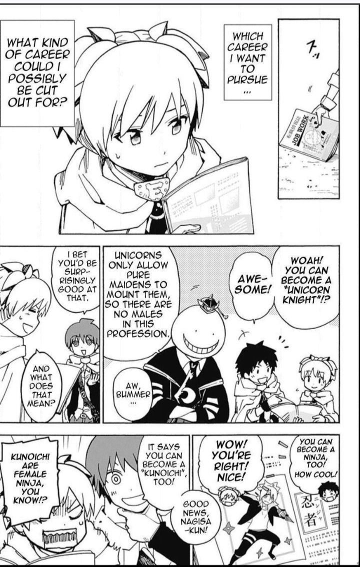 Lúc này nagisa được sugino khen có thể trở thành hiệp sĩ kì lân thì karma nói rằng nagisa sẽ rất ngạc nhiên khi làm tốt. Còn nagisa thì có vẻ biết là có ẩn ý. Thì được karma chốt luôn là nagisa có thể trở thành kunoichi(nija nữ).