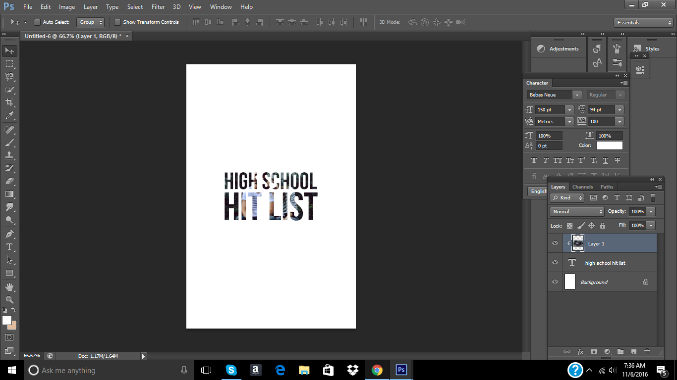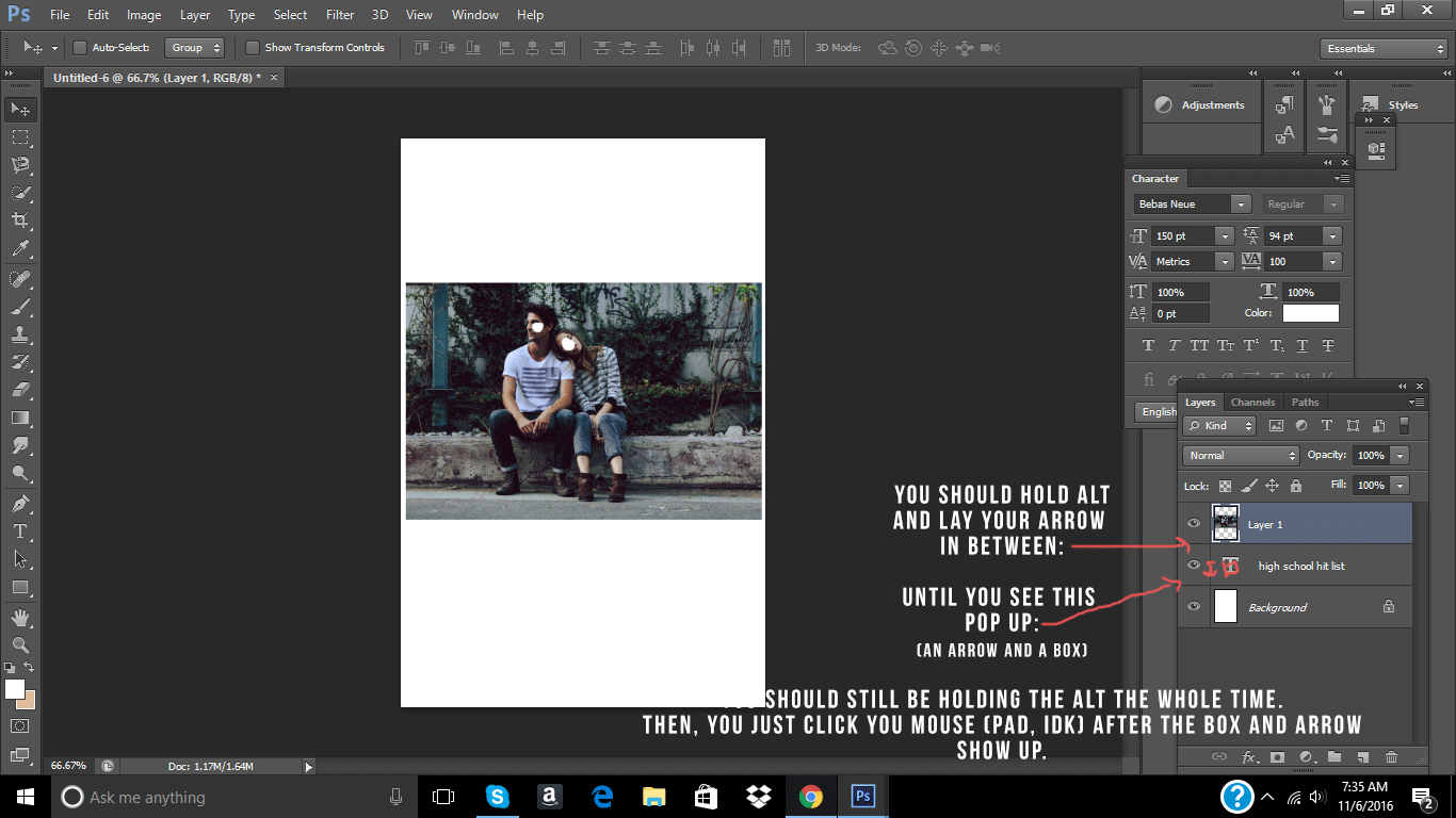 Step Three: Bring out the image over the words. Then, press your Alt. key before you drag your mouse in the middle of layer one (the layer above the text) and the text. Still holding Alt., a small box and a arrow should show up. Once that happens, just click your mouse pad or whatever, and then the image should go inside the words.