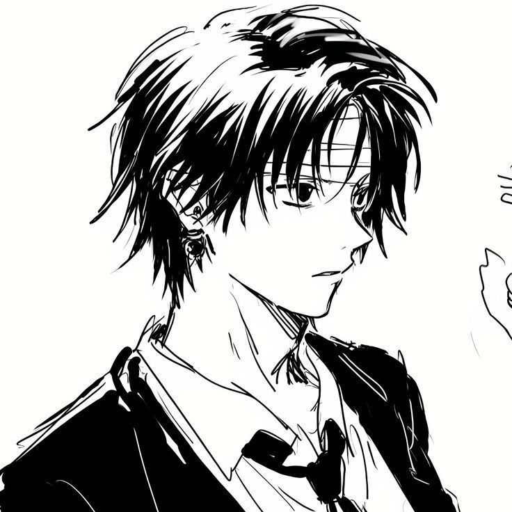 Anh ta mặc chiếc vest màu đen thanh lịch, mái tóc đen rẽ hai bên, trên trán đeo chiếc băng màu trắng.