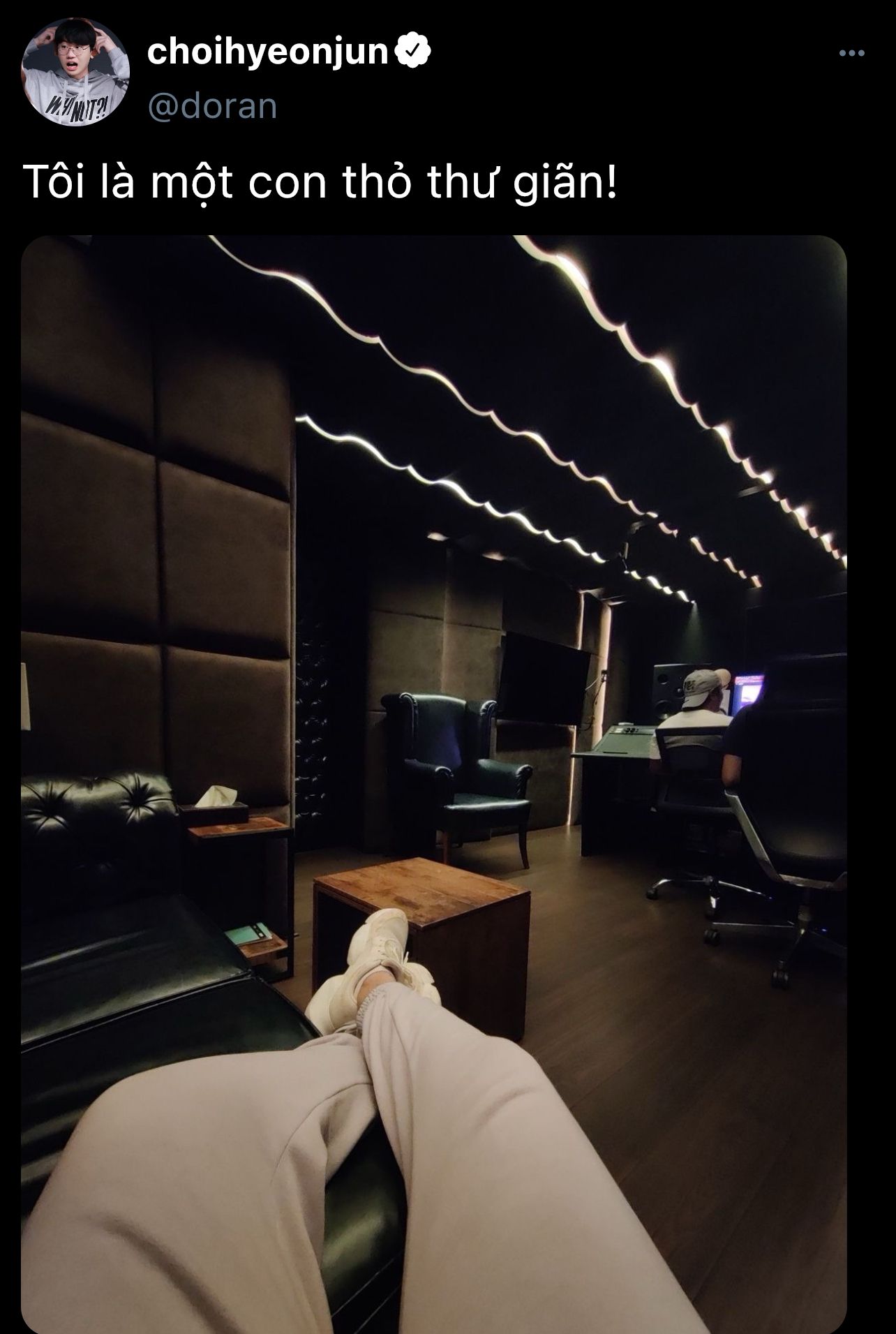 Góc bên kia, Wooje đang vắt vẻo trên chiếc ghế xoay, tay cầm một lon nước, chân khẽ đung đưa theo nhịp nhạc. Thỉnh thoảng cậu lại góp vui bằng cách nhại lại mấy câu rap của Poby với chất giọng đáng yêu nhưng lại cố tình thêm vài biểu cảm hài hước, khiến nhóc con cười lăn lộn, còn Hyeonjun lớn thì chỉ biết lắc đầu cười bất lực.