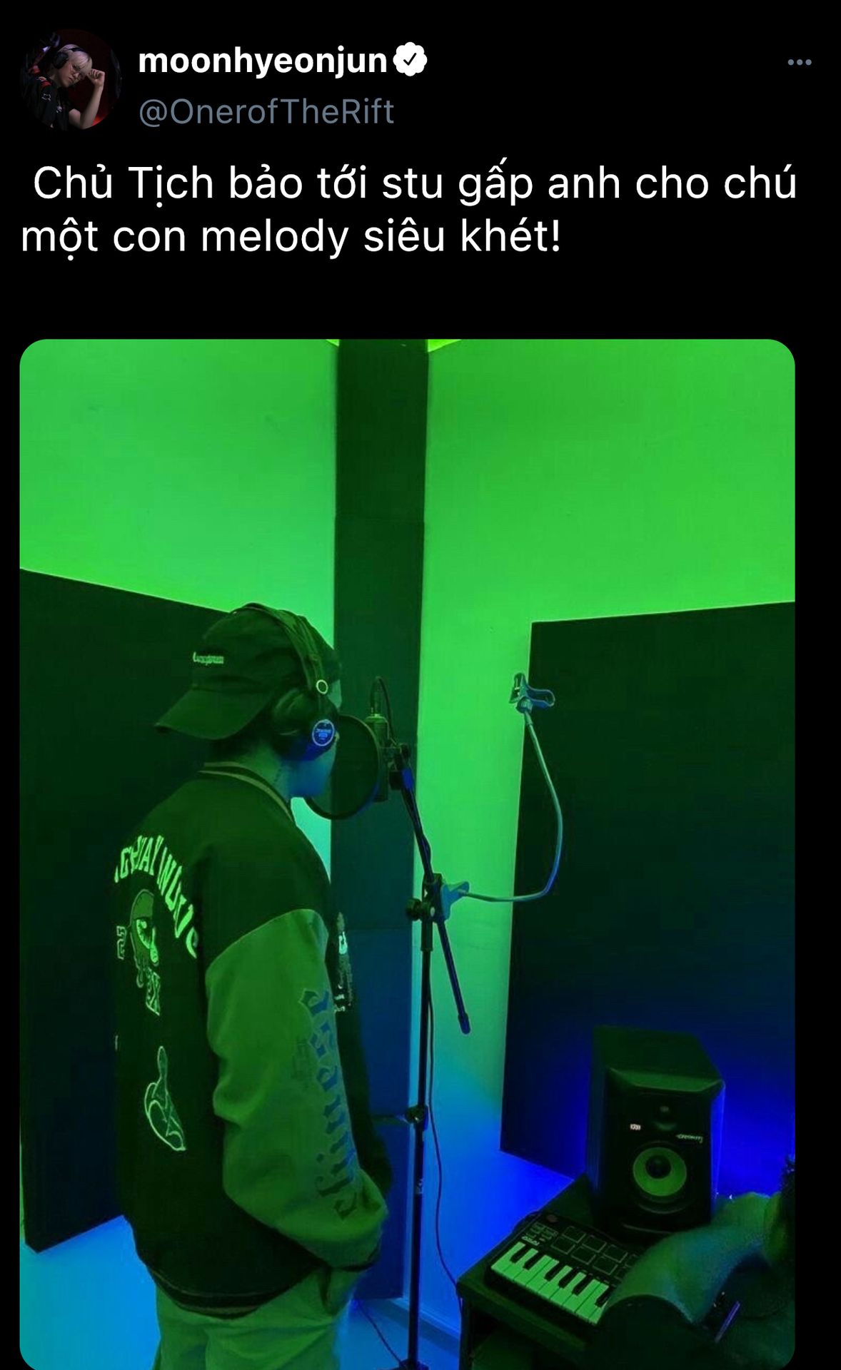 Oner, hay còn gọi là Hyeonjun nhỏ, một rapper nổi tiếng với khả năng melodic rap tài tình, đang đứng trước micro. Một tay cậu giữ tai nghe, tay kia vẫy vẫy theo nhịp điệu, mắt nhắm hờ để cảm nhận trọn vẹn từng câu từ. Giọng hát cậu vang lên, trầm ấm, dày dặn, từng nốt nhạc lướt qua đầy cảm xúc và chân thật. Cậu nghiêng đầu, đôi mắt ánh lên sự tập trung, cố gắng hoàn thiện từng đoạn hát một cách chỉn chu nhất.