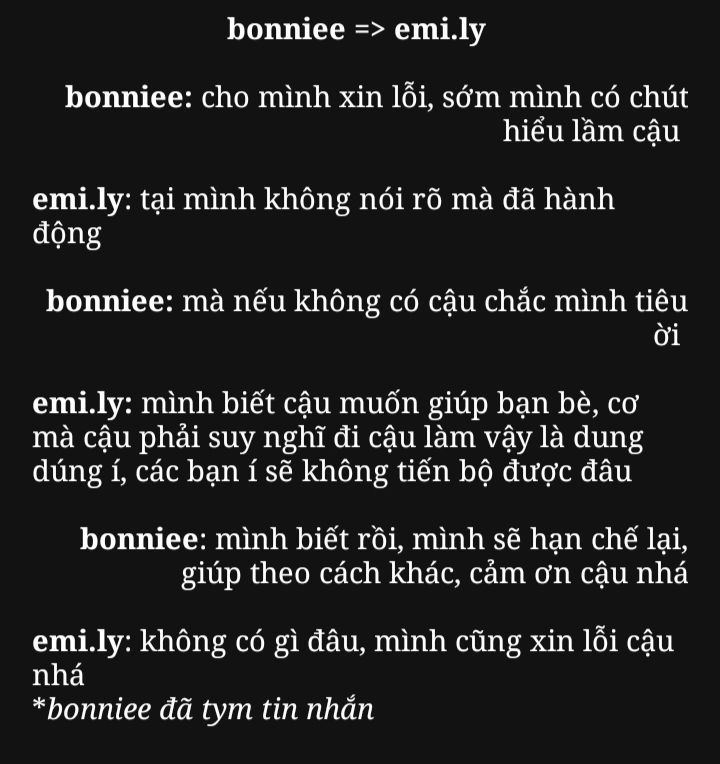 Tiếng tin nhắn đồn dập tới mà Emi không thèm xem luôn, chỉ ngồi yên cho Bonnie dựa vào vai