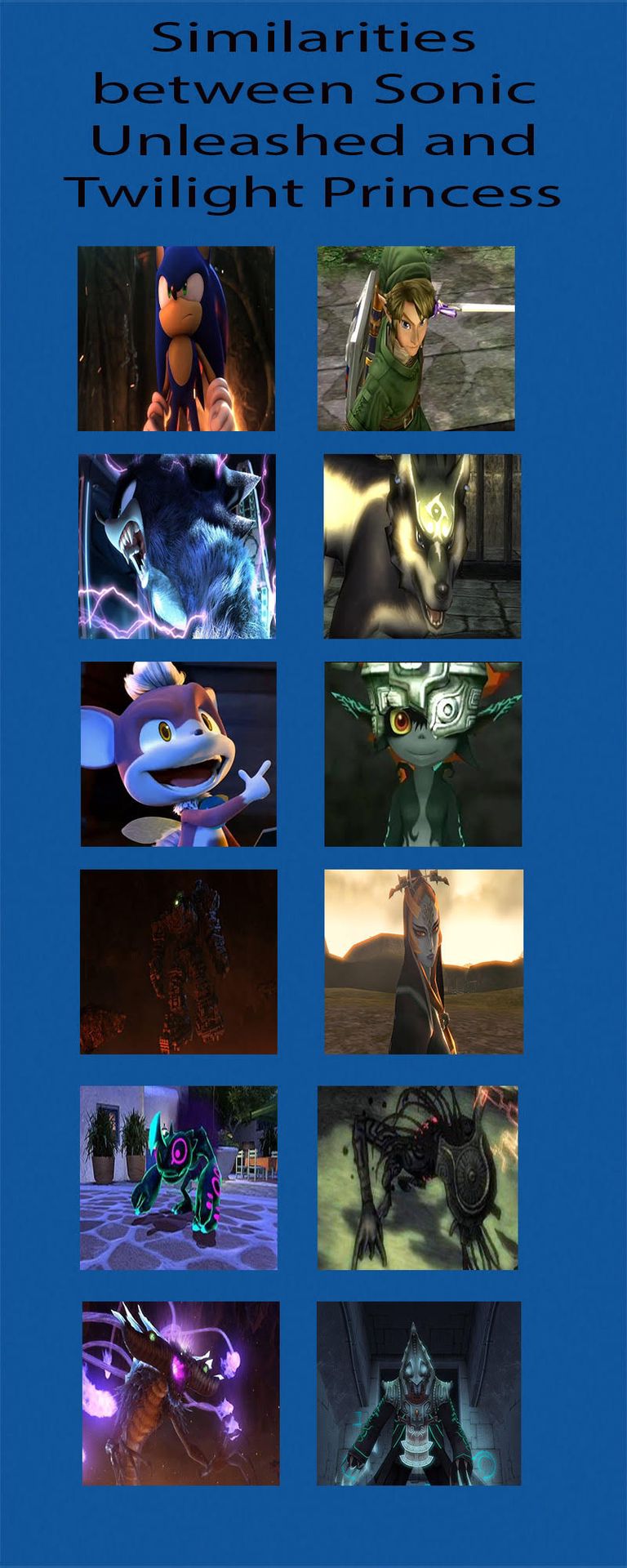 Finally, the comparison of the two games. Left is Sonic and right is Zelda. See the comparisons of the two games? Think about it and if you see it, feel free to let me know what you think. Also, feel free to ask anything about the comparison if you wanna know how one specific side is associated with the other.