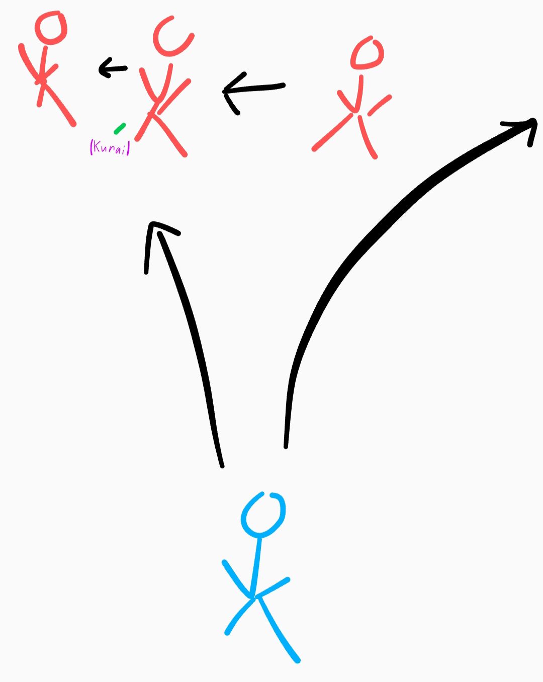 Nhưng trái với suy đoán của tôi, Rahito nhẹ nhàng ném chiếc kunai trên tay xuống đất ngay dưới chỗ chân mình, cậu ta dùng 1 chân đạp vào cái kunai như 1 điểm tựa và xoay người nhảy sang trái.