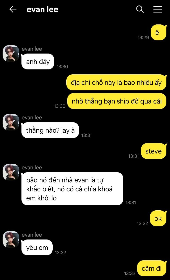 - nếu thèm thì cứ nhắn anh một tiếng, anh xong việc anh về ha. nước một bình hai lít đây, đồ ăn vặt để trong hộc dưới chân em, đồ chơi trong tủ đầu giường, wifi tên lee evan mật khẩu là sinh nhật em, cứ thế mà dùng. anh đi nhé.