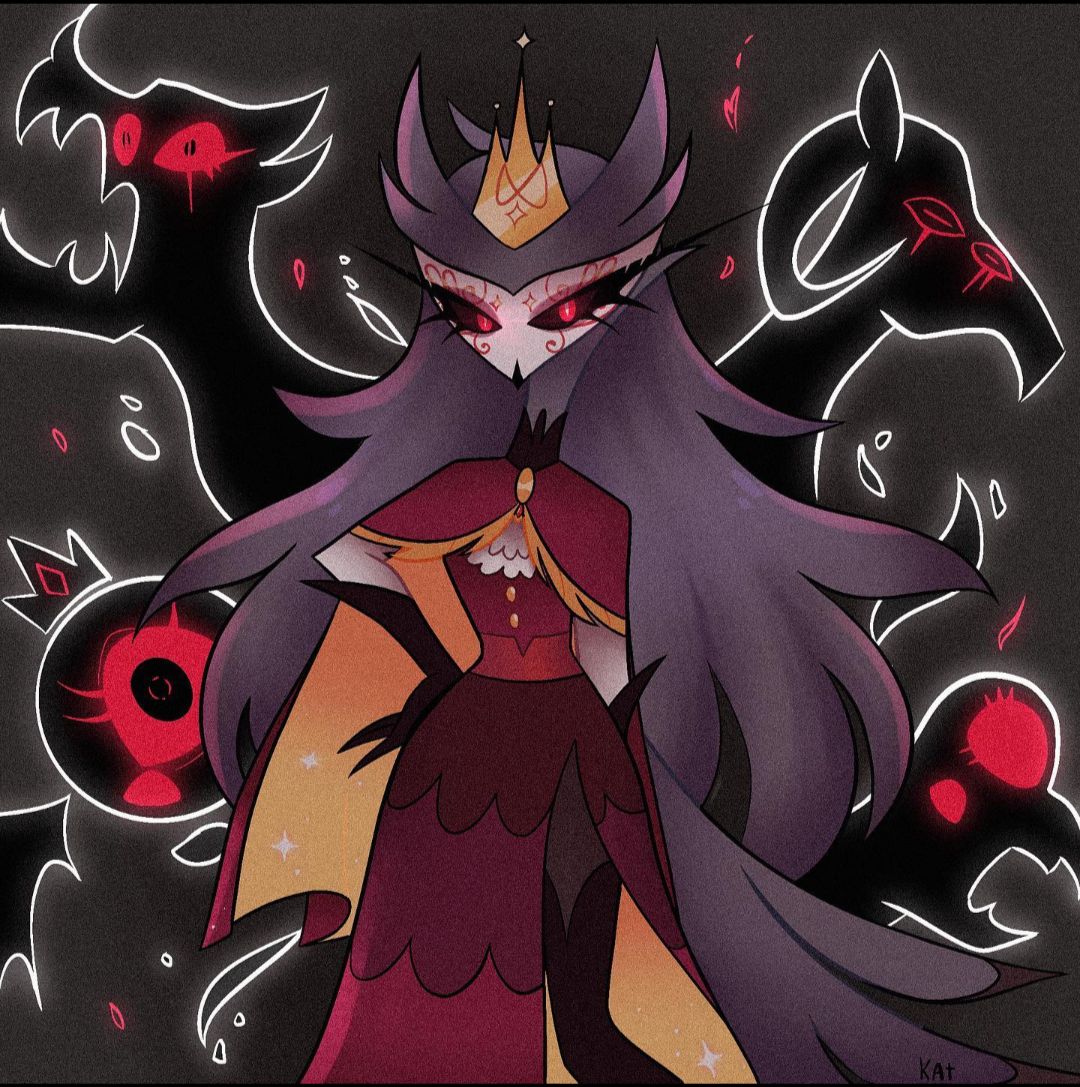She wears a towering crown with jagged, golden spires - more like horns than ornament - which seems fused with her very skull. Her hands are long-fingered and claw-like, always wrapped in rings and adorned with infernal markings.