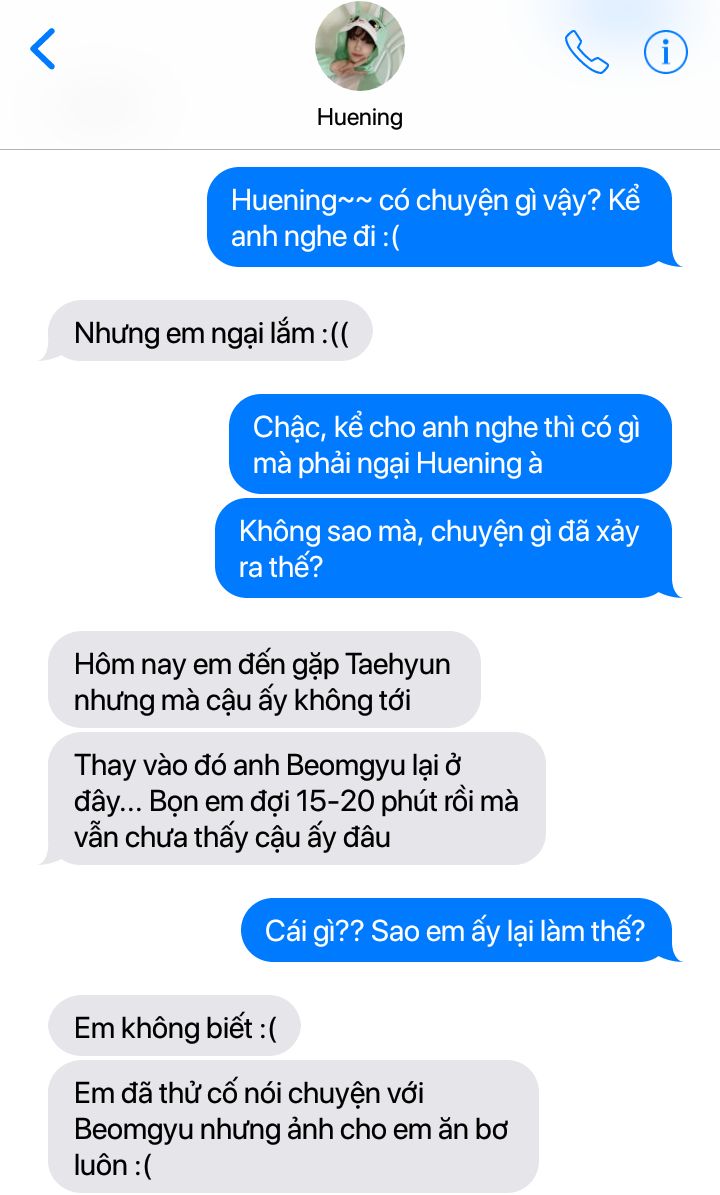 "Em ấy nhắn tin muốn nhờ em đến xem thử buổi tập luyện nhưng cuối cùng lại không xuất hiện, và có vẻ em ấy cũng nhắn cho Kai y như vậy luôn" Beomgyu thở dài một hơi.