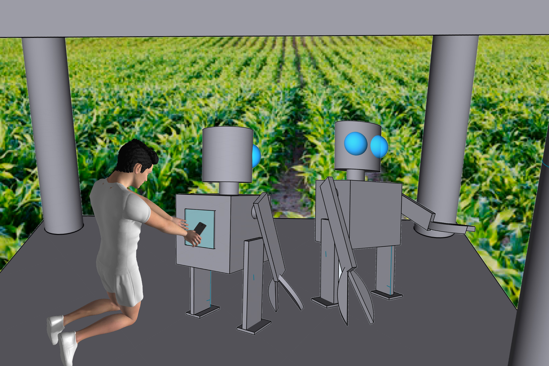 The robots are just metal box shaped units with two legs and arms. Their bucket heads have swiveling optical eyes connected to computer systems that communicates with COMA. Their main function is to maintain the agricultural plants, so they weren't all that intelligent.