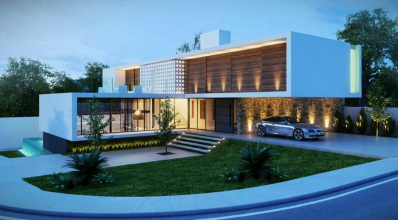 His house was modern, with a little bit of grass and a few simple trees around it. His house was white with a unique shape. The bottom left part of the house was see through because instead of walls, the front part was made of glass. The top front right part was made of wood. The area around the house was very spacious and organized, illuminated by the lighting around the house.