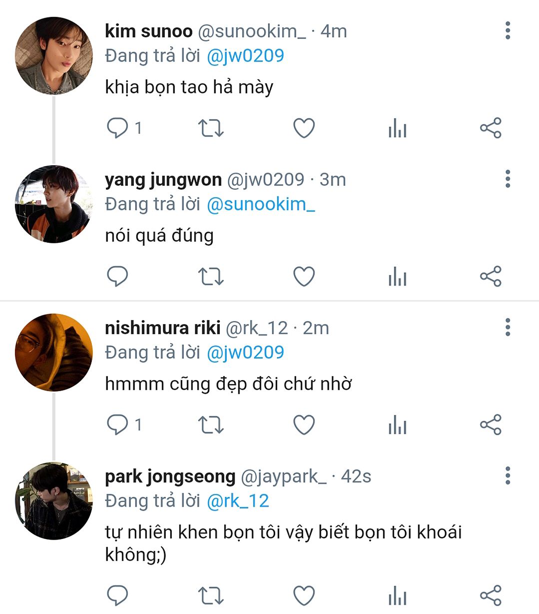 jw:"tụi bây ăn gì chưa? Tao với jongseong đi ăn no hết trơn rồi kkk."