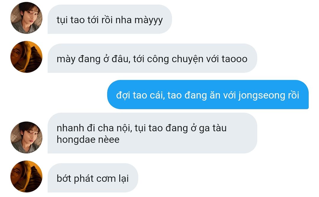"jongseong à, tụi nó tới ga tàu rồi nè. Giờ tụi mình đi đón tụi nó đi ạ."