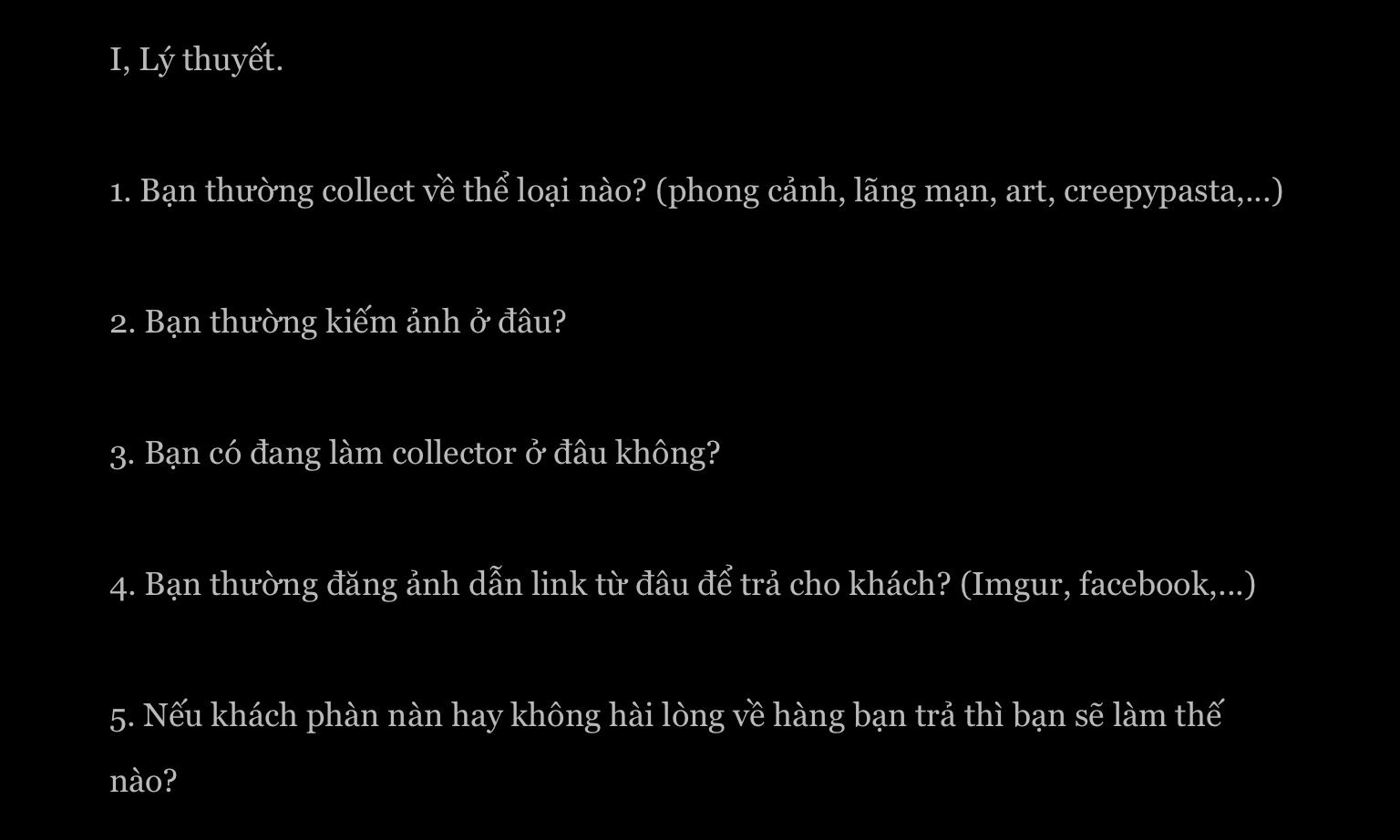 1. Mình có thể collect tất cả thể loại ảnh, không chuyên về thể loại nào cả.