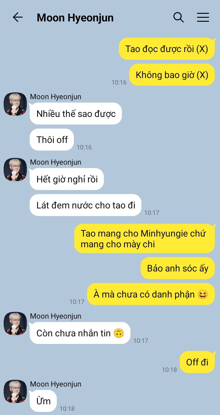 Dohyeon nhìn tin nhắn từ Moon Hyeonjun trong điện thoại rồi lại nhìn lên Minseok. Cậu nghĩ trong đầu vài câu lại vô thức nói ra thành tiếng: