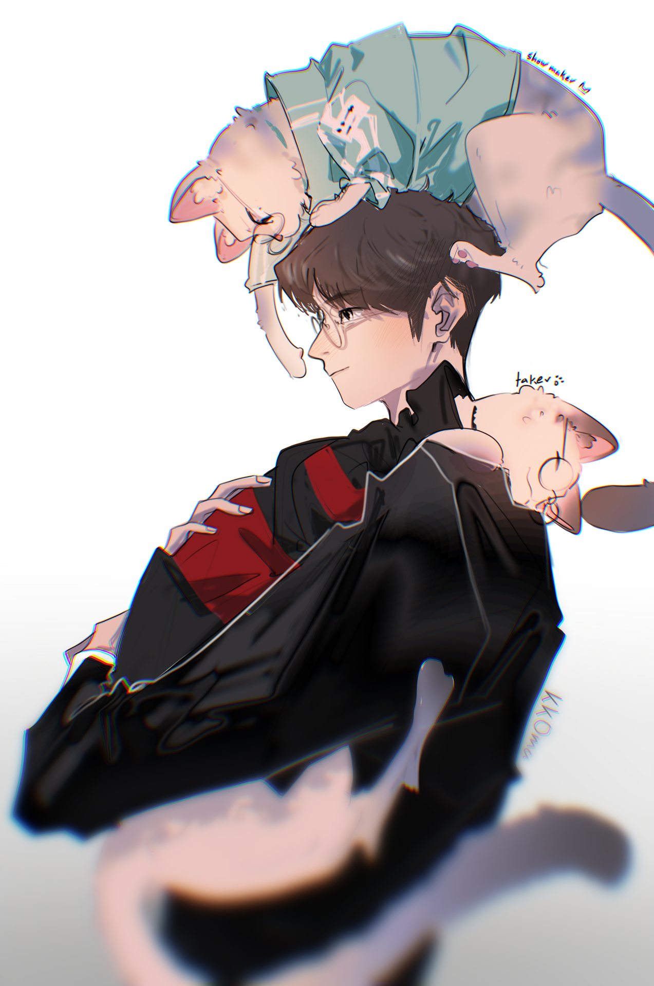 "Anh Sanghyuk ơi... Làm ơn hãy bỏ cái ly xuống cho em, được chứ?'' Han Wangho ngửa đầu nhìn một con mèo trên nóc tủ, hảo hảo dỗ ngon dỗ ngọt khuyên nhủ. Con mèo mặc áo khoác đội màu đỏ đen do dự một chút, cuối cùng vẫn ngoan ngoãn buông đồ trong miệng ra.