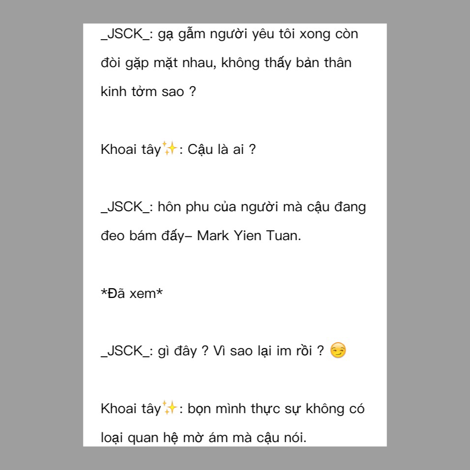 Khoai tây✨: Xin lỗi vì em đã chen giữa tình cảm của hai người. Thôi thì cứ xem em là thử thách tình yêu đi, cậu ấy yêu anh nhiều lắm đấy Mark ạ.