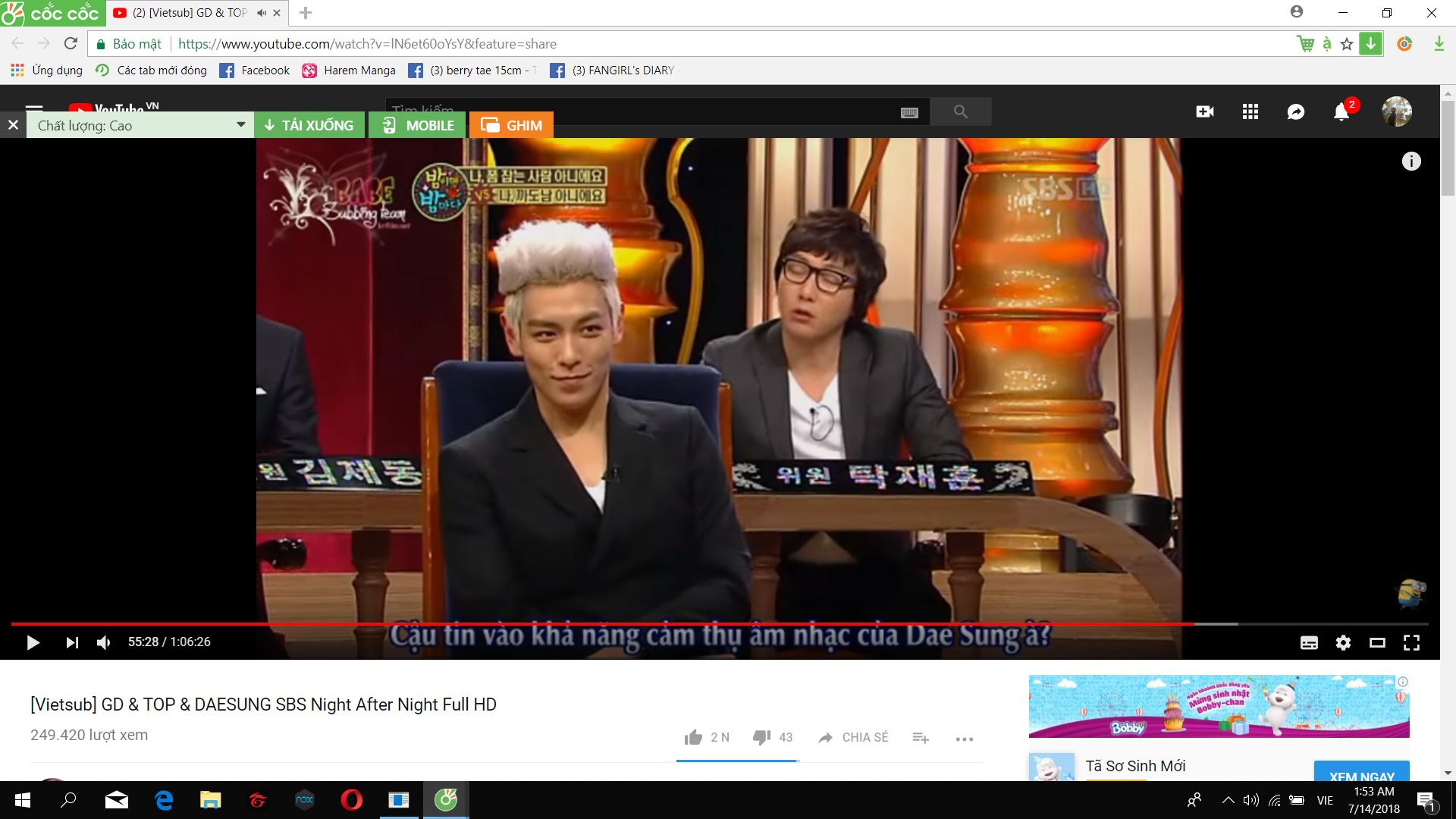 À đôi tới gần cuối đi nha..khi đang hỏi mận nhưng chú Mc lại chen ngang hỏi Top vào và nói rằng Dae bị làm phiền khi Top sáng tác lém