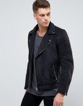 Black jacket he wears, and then black jeans, and he has scars on his hands and face and along the neck and some are jagged.