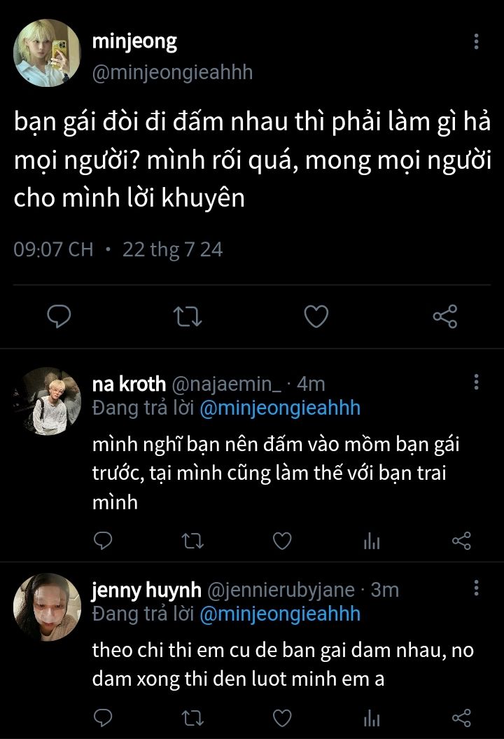 jimin biết em giận lắm, cúi đầu suốt không dám nhìn em, lúc nào cảm thấy em đã bình tĩnh hơn là hôn vào mặt em nhiều cái. minjeong nhìn tay chân jimin đầy vết bầm, thương đến phát bực nên đấm một cái vào vai chị rồi lại xoa. cứ vì em mà nhận lời thách thức vô nghĩa, hết uống rượu rồi lại boxing. jimin đã hiếu thắng thì chớ, thêm cái bọn kia cứ thách đểu, combo này làm minjeong đi dẹp loạn mệt nhũn cả người