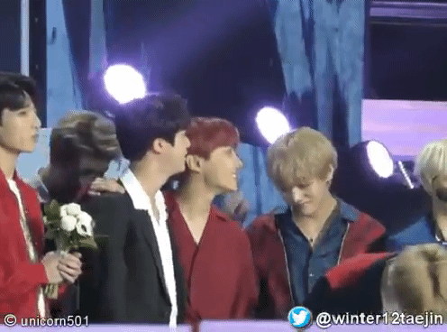 Đầu tiên là cho quả gif rất nhẹ nhàng. Bạn Tae đang nắm tay bạn Hoseok thì anh Jin đã đi đến vì định ôm bạn Tae. Sẽ rất bình thường nếu bạn Kim Cún không thả tay bạn Hy vọng rồi nắm lấy tay anh Kim Sóc với tốc độ thần thánh