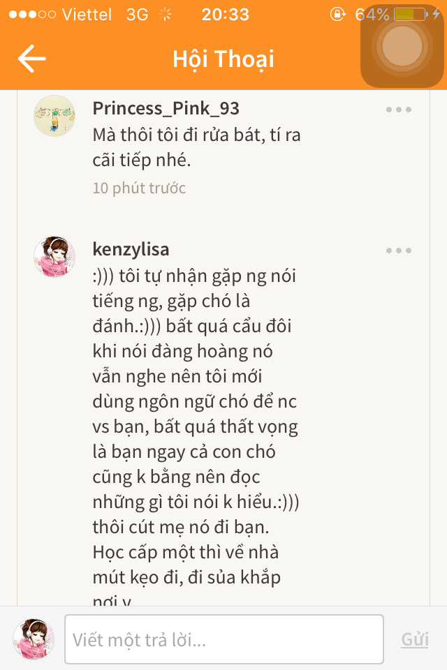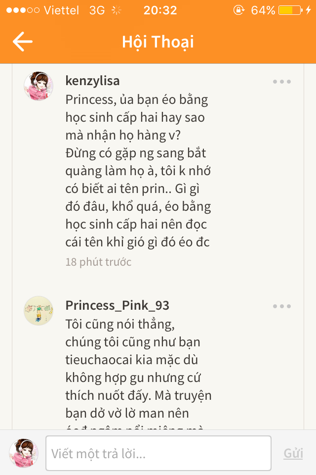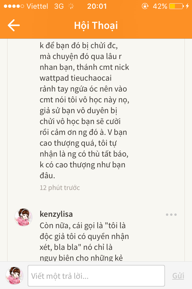 Thứ sáu, tôi đã lười cãi lộn cùng bạn ấy (nick wattpad tieuchaocai) nên nói "bận, k nc nữa" thế nhưng, bạn ấy vẫn đeo bám theo gây chuyện, tôi block.=))))