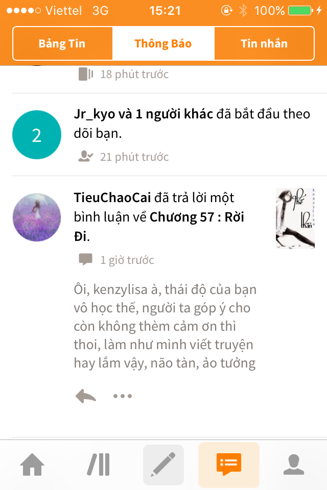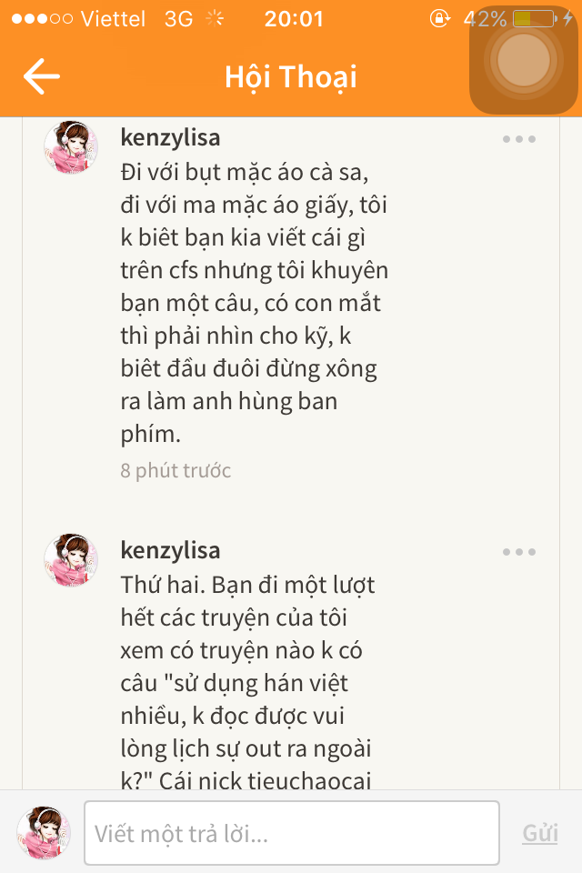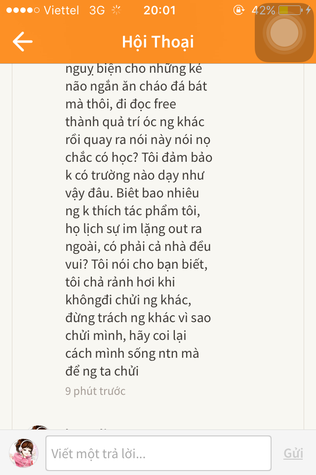 -"Truyện tôi viết là giết thời gian và chia sẻ cảm nhận, không kiếm cơm nên tôi không biết khái niệm độc giả là gì đâu. Với tôi, những ng ở lại đọc truyện là những người có tâm hồn đồng điệu theo từng con chữ tôi viết, còn lại mời lịch sự out ra ngoài, đó là hành vi cử chỉ của ng có văn hoá, mà không có văn hoá tôi chửi ráng chịu, đừng có lôi câu "tôi là readers tôi có quyền xxx, tôi là độc giả tôi có quyền yyy, bạn là tác giả bạn phải zzz" xin lỗi nghen, mơ k đánh thuế, nhưng mơ giữa ban ngày là bệnh phải trị, những ng mang thuộc tính " ta là readers ta bla bla,.." Vui lòng né truyện tôi ra. Cảm ơn.
