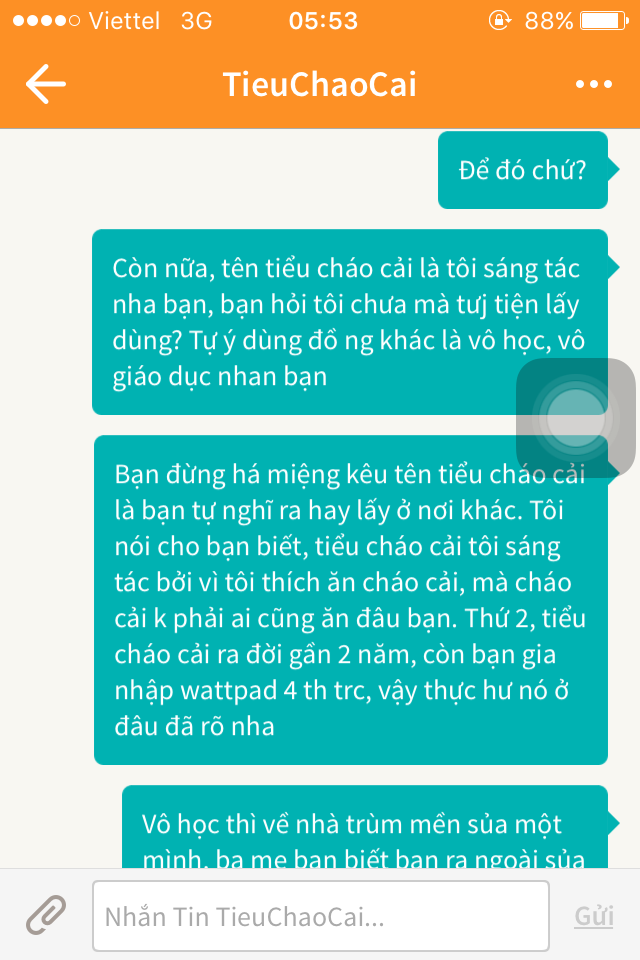 Thứ hai, cm bạn, tôi xin đính chính với bạn có nick wattpad tieuchaocai là tôi là ng có văn hoá nhé. Ăn hết cơm hết gạo ba mẹ, tốn tiền học vô số sao không có văn hoá đc?