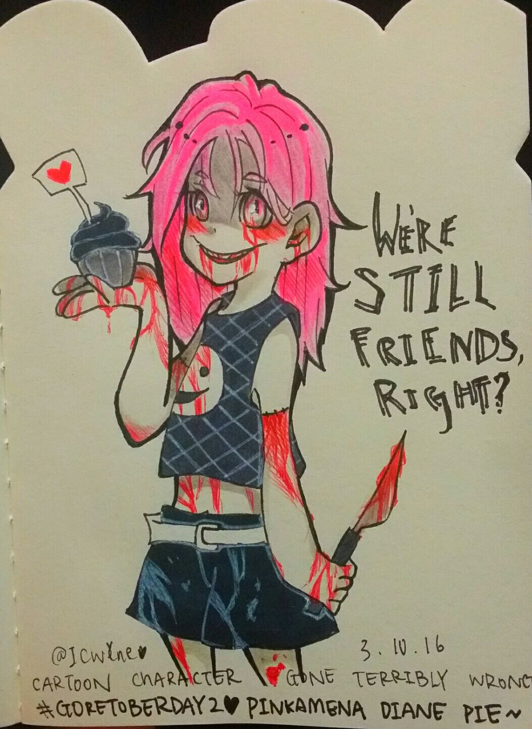 Yep... I'm planing to make it worse day by day :P I love drawing blood, I was never good at it x'D Anyways, if you haven't notice it by now, the character above is a creepypasta called Pinkamena (Pinkie Pie from My lil' pony)!