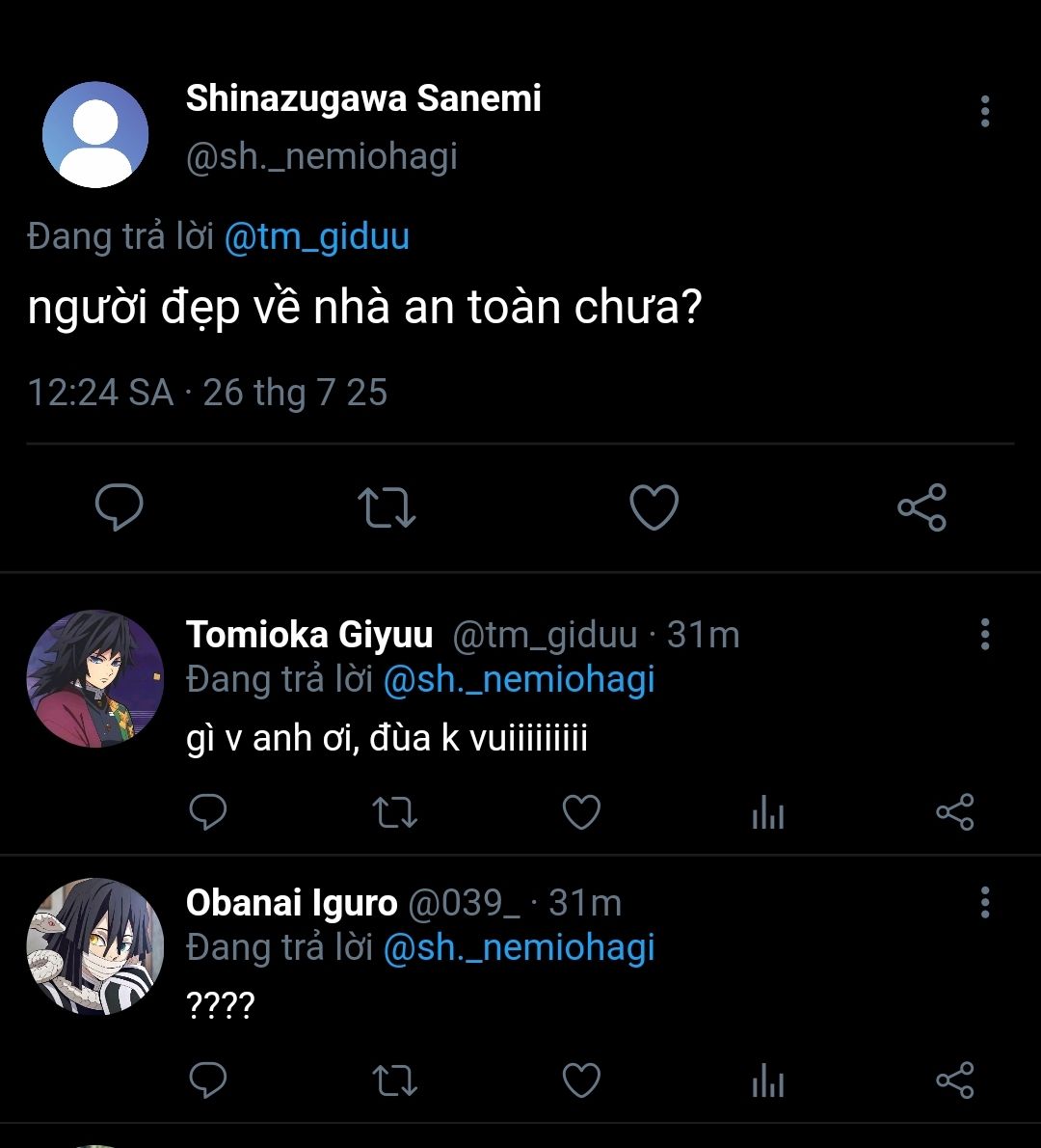 giyuu thì chẳng nói gì, vẫn im lặng rót trà cho muichirou. sanemi nhìn theo, lưng tựa vào ghế, khóe môi hơi nhếch lên như muốn cười nhưng kìm lại.