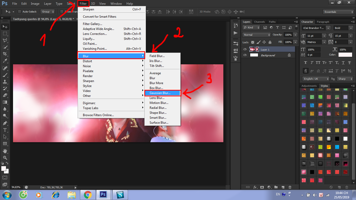 Bước 9: Là bước làm mờ giống với ver điện thoại. Và một bước vô cùng quan trọng trước khi làm mờ đó chính là nhân đôi layer Ctrl + J. Sau đó vào Filter -> Blur -> Gaussian Blur và chỉnh thông số làm mờ tùy theo ý bạn