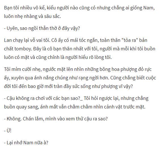 => Cô ấy lại hỏi thế, hai năm qua, mỗi khi tôi ngẩn người là mỗi lần tôi nhớ về Nam và cũng là bấy nhiêu lần Lan hỏi tôi câu ấy, "Lại nhớ Nam nữa à?".