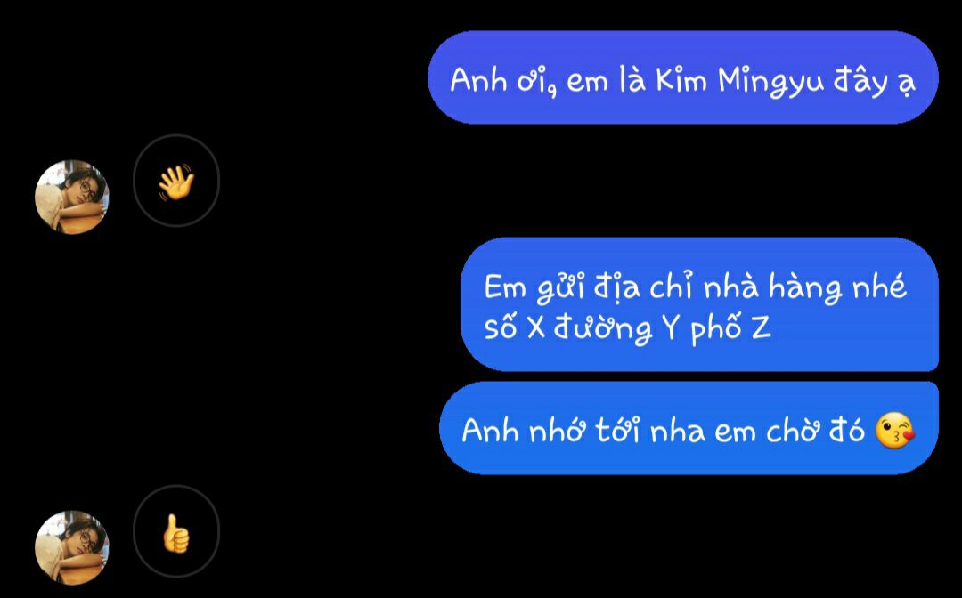 " Biết ngay mà, bảo sao hôm nào cũng xin về trước tao. Ra là đi xà nẹo anh Jisoo. " Mingyu móc điện thoại ra đưa số cho bạn.