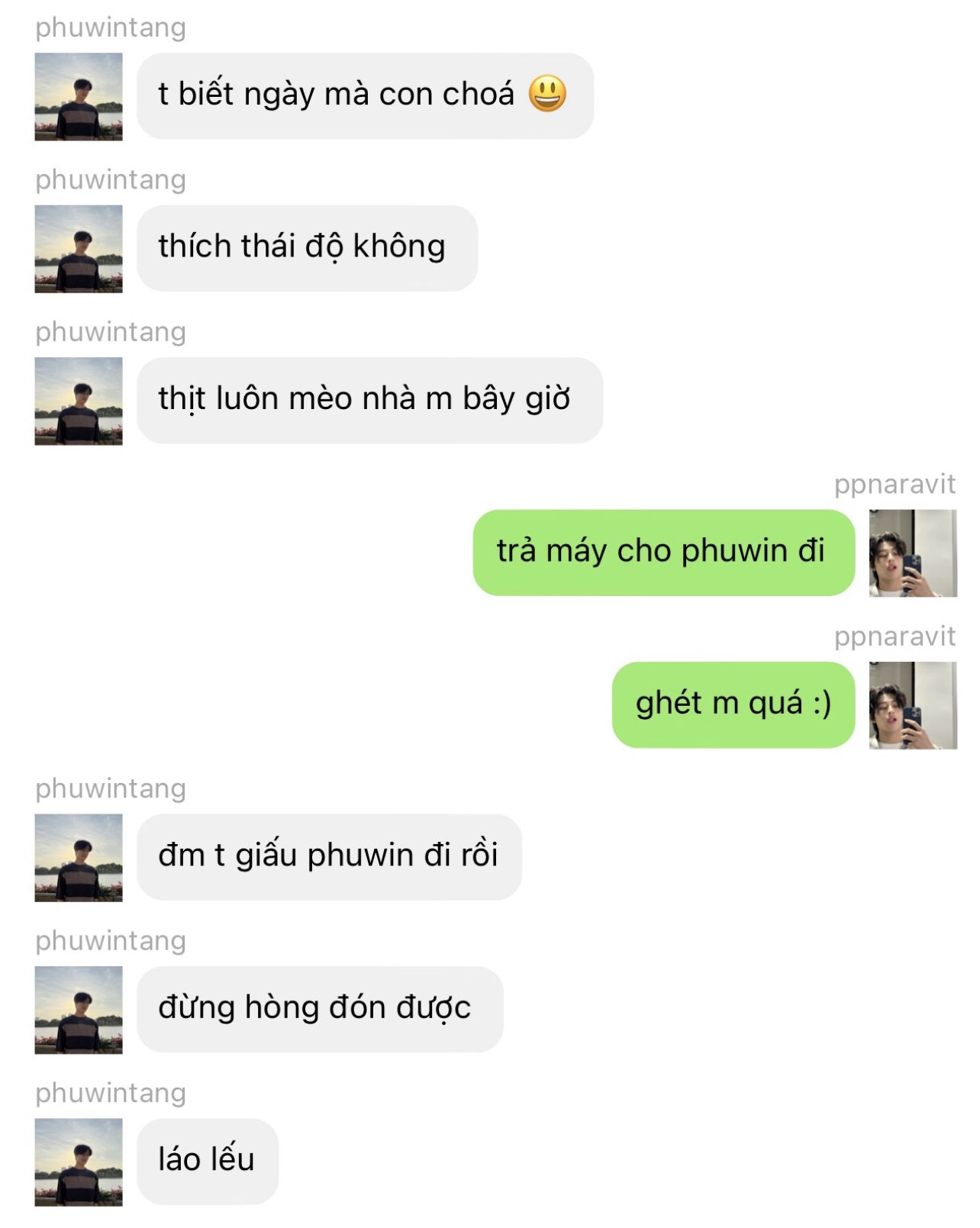 "hôm nay vui không phuwin? ba người đã chơi những gì vậy?", cho nên tôi phải mở lời hỏi han em trước.