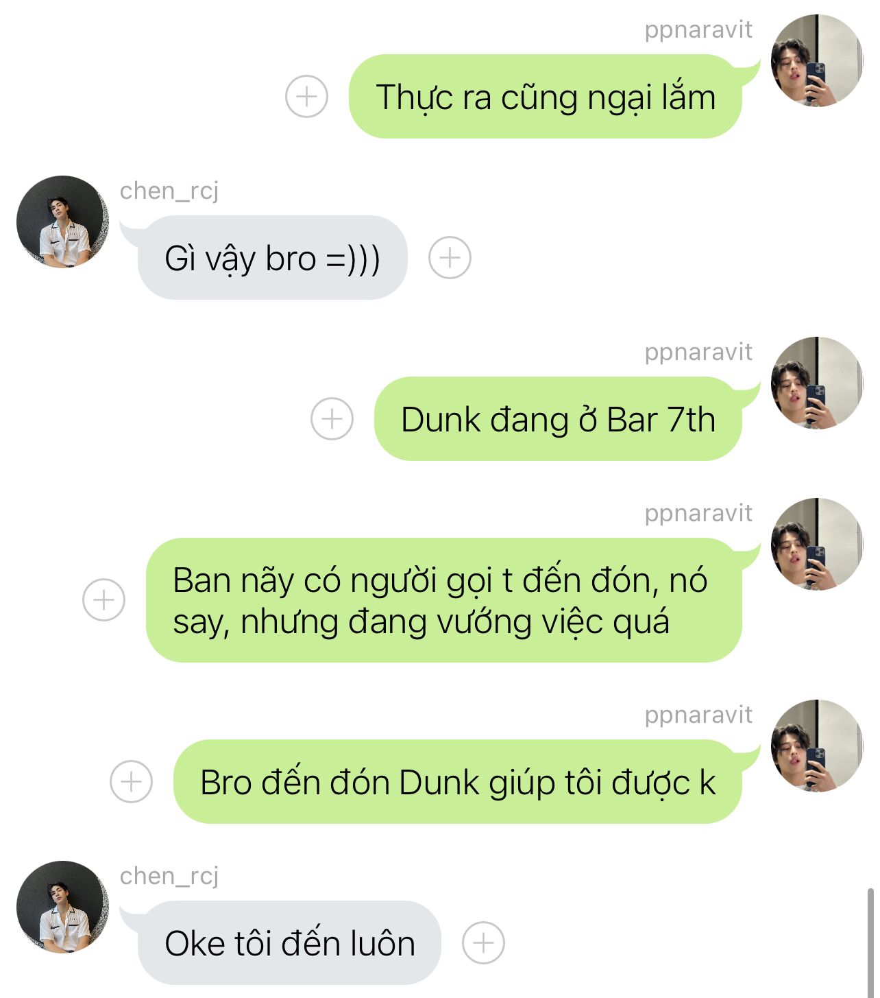 10 phút kể từ lúc nhắn tin, Joong đã tới quán bar. Pond đang ngồi ở một bàn khác trong góc nhìn đến Dunk. Joong mới tới đã xác định được người kia ngồi chỗ nào, liền nhanh chóng tới gần kiểm tra tình hình.