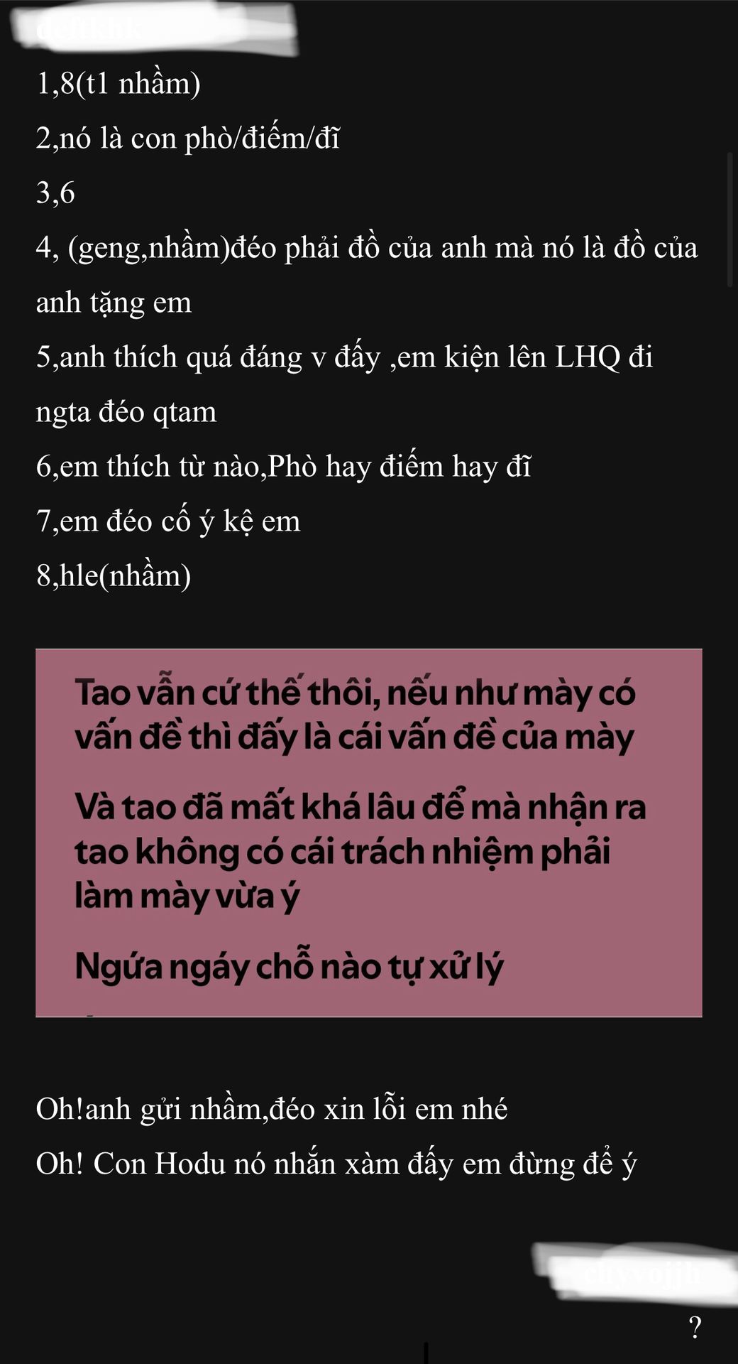 T biết m nhắn vs ai r nhưng quan trọng là mày qua nhà con phò/điếm/đĩ lấy đồ ông Hyuk Kyu tặng chưa?