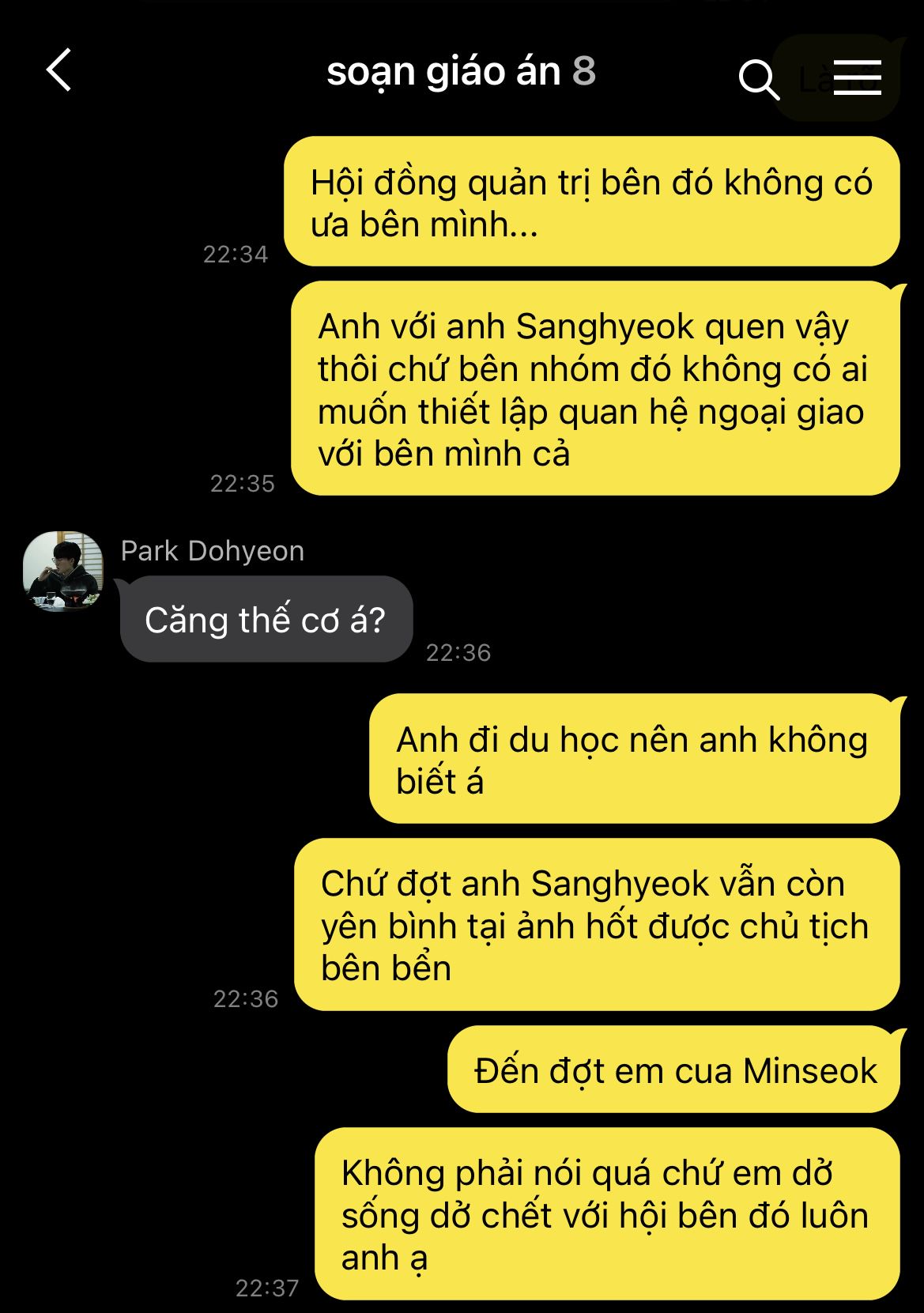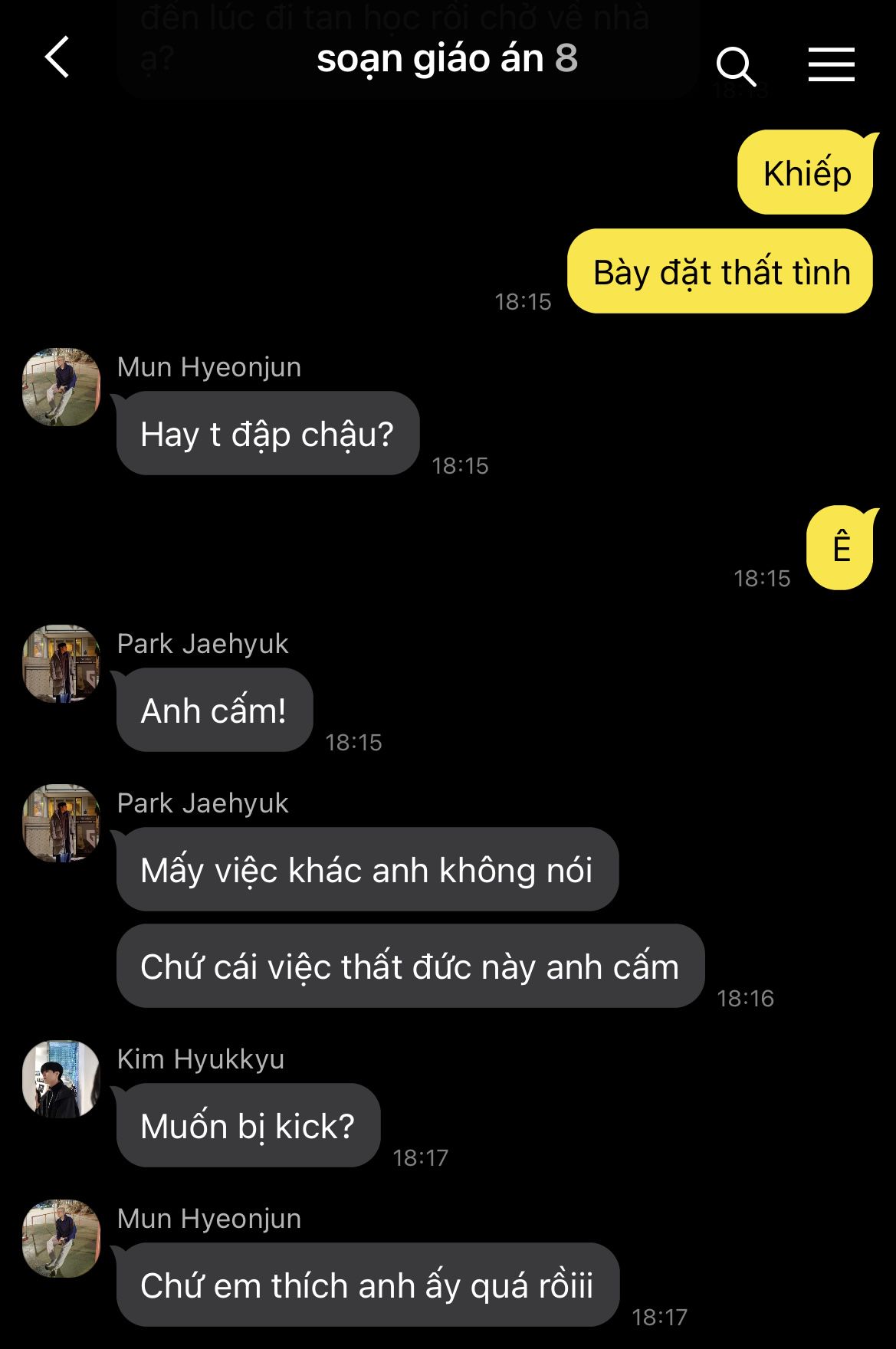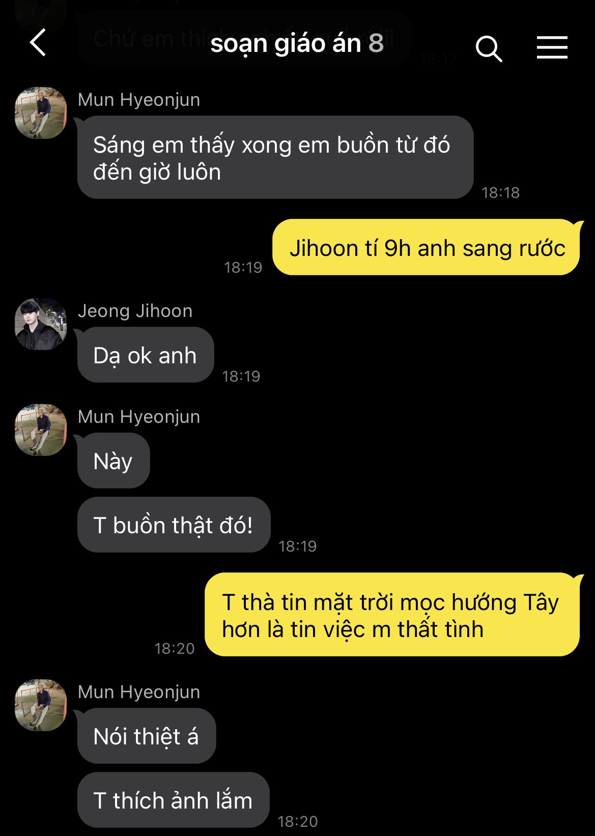 Còn lại ba "con báo" kia thì khỏi phải bàn. Mỗi người một kiểu, kẻ thì gục xuống bàn, kẻ thì ngả người lên ghế như sắp bay vào cõi mộng. Trong bọn, chỉ có Mun Hyeonjun là vẫn còn lơ mơ nhận thức được tình hình. Trái tim cậu nôn nao vì biết chắc rằng người trong mộng hôm nay chắc chắn cũng đang đi cùng Han Wangho.