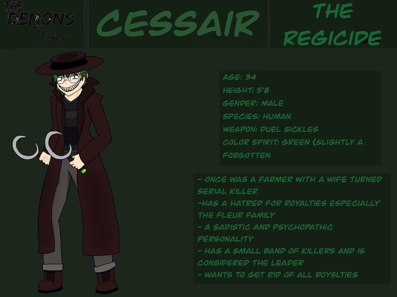 Meanwhile, Cessair loomed over her, his sickles slowly retracting back to the handles, blood dripping from the blades as he approached her.